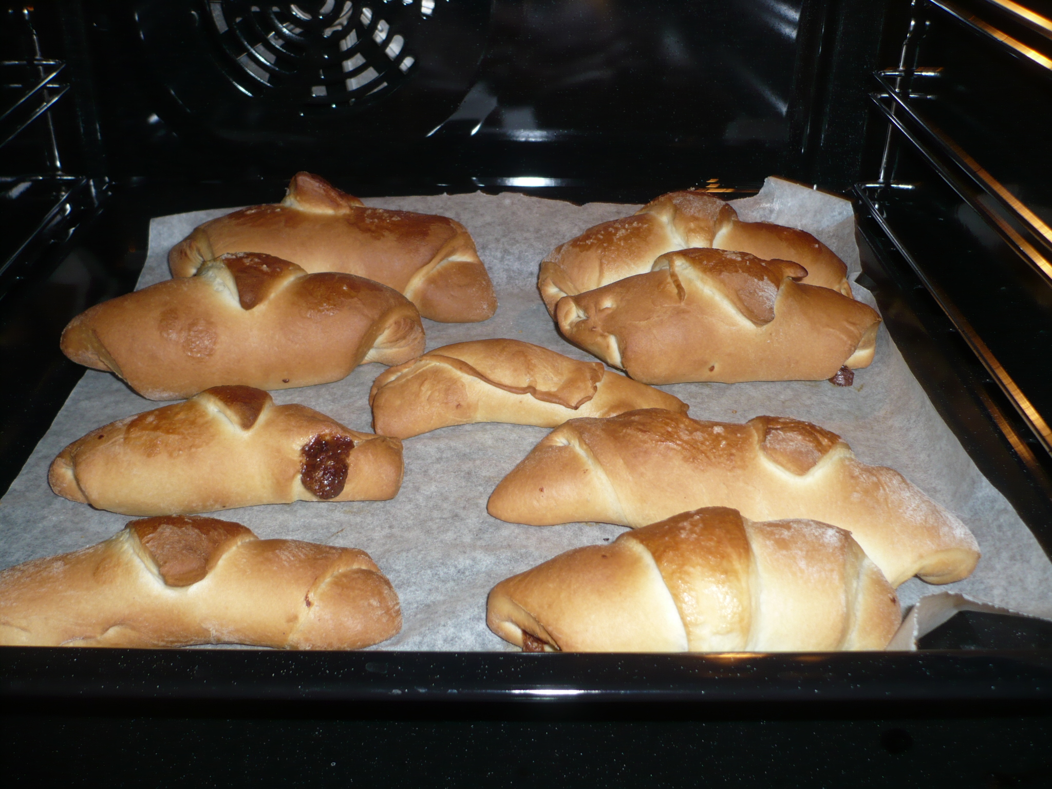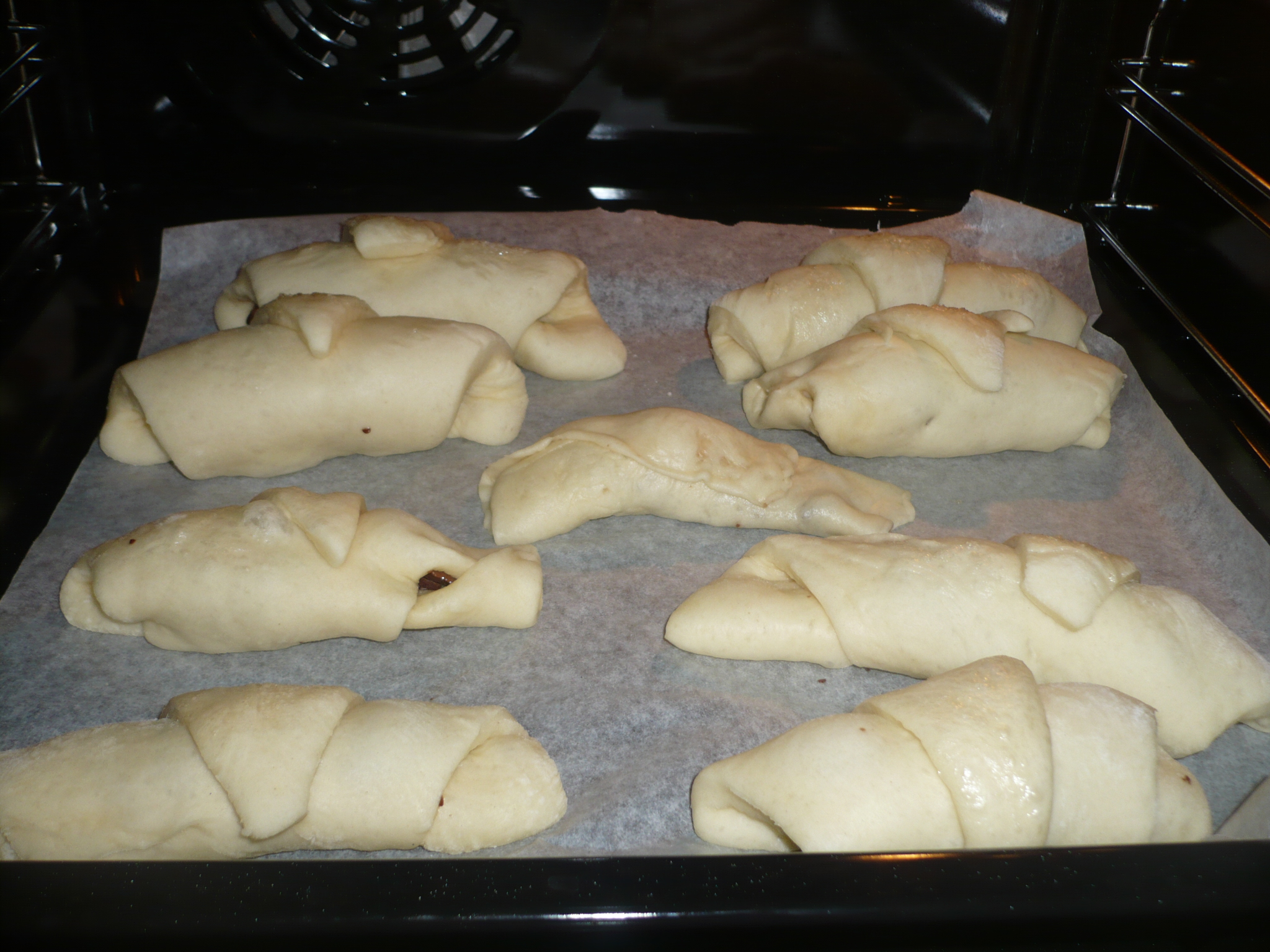 dare la forma dei cornetti.Poggiare ogni cornetto sulla carta forno , lasciare lievitare ancora un’ora in forno spento o coperti.