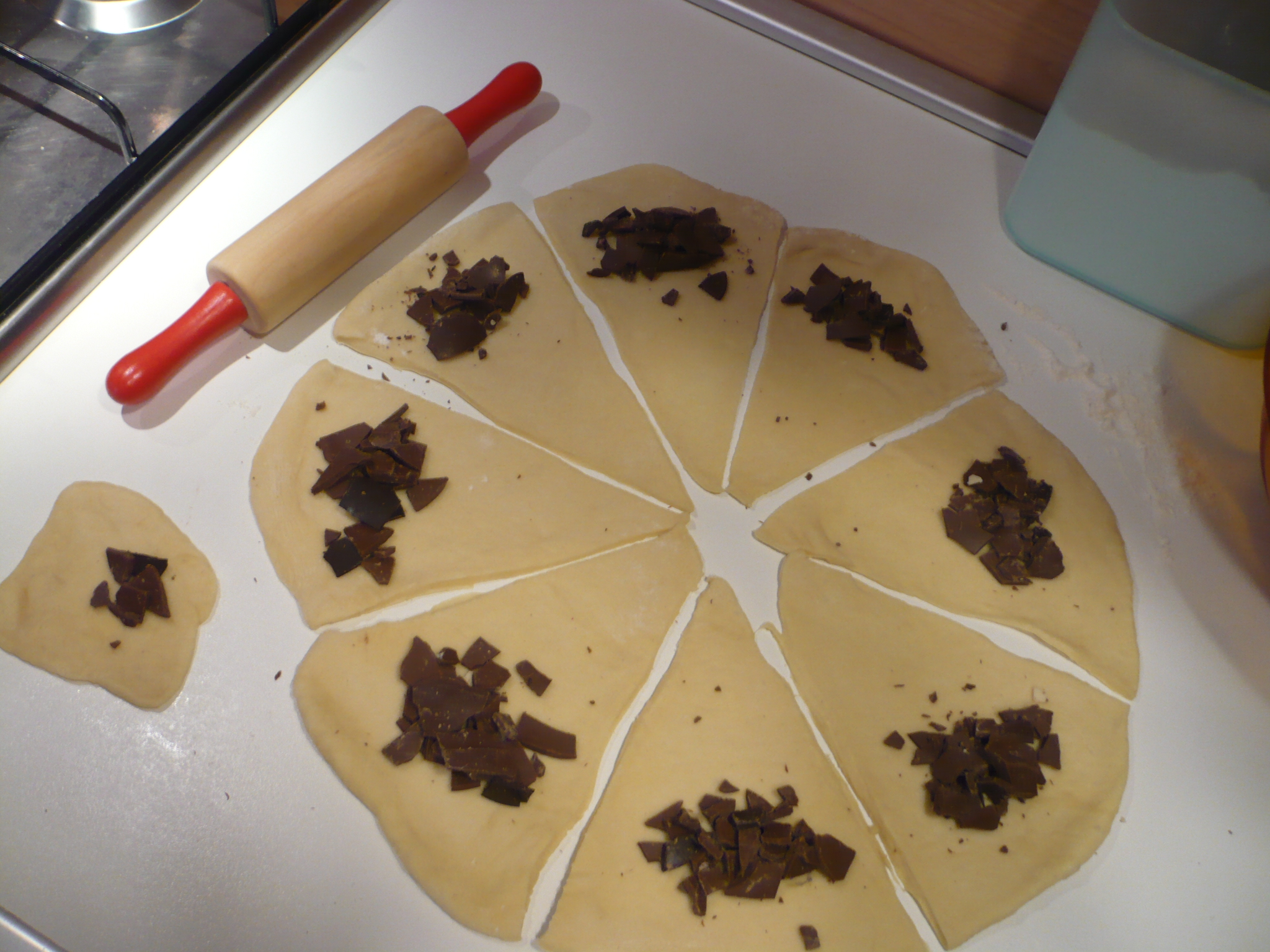 carta forno.Dividere la pasta in 3 porzioni e stenderli a cerchio e ricavare 8 triangoli per ogni panetto,