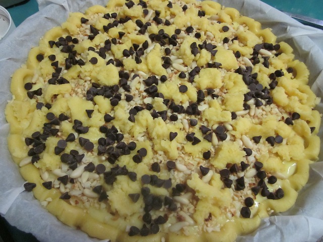 versa la crema bimby, ricoprire con la restante frutta secca, le gocce di cioccolato e la pasta tenuta da parte sbriciolata.