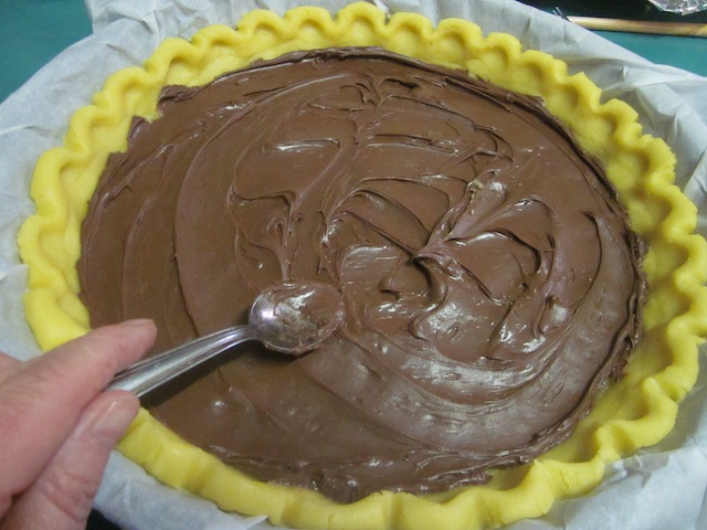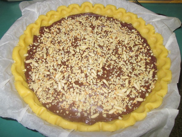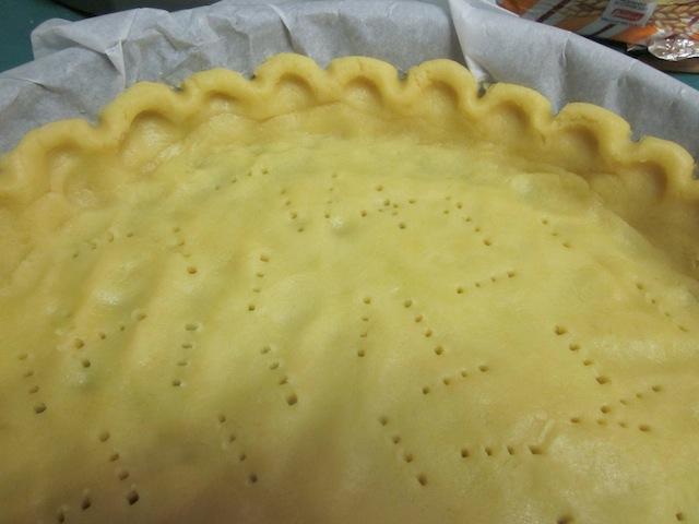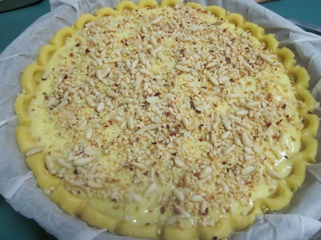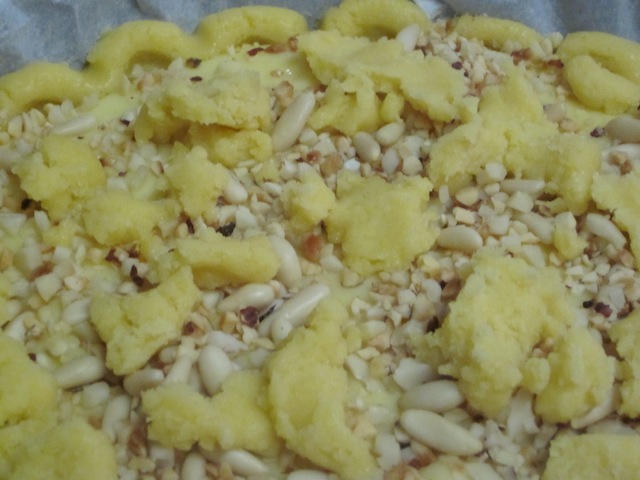 riprendere la pasta frolla, toglierne un pezzo grande più o meno come un'albicocca (servirà per metterla sbriciolata in superficie) stenderla in una teglia di 28 cm foderata da carta forno avendo cura di fare i bordi un pò più alti di una normale crostata!!!