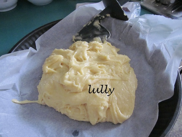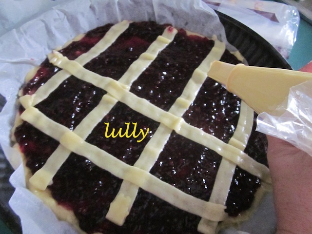 - Foderare con la carta forno uno stampo da 26 cm, versare l'impasto ottenuto, conservandone circa 4 cucchiai per le strisce.