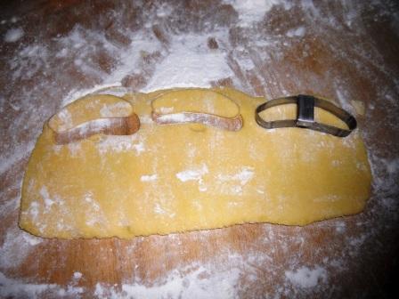 "coperchio chiuso" infarinare un tavolo di legno e con un pezzo d'impasto tirare una piccola sfoglia alta non più di mezzo cm. e tagliare i biscotti con l'apposita formina che andranno a formare le bananecon i ritagli di pasta tagliare le ciliege
