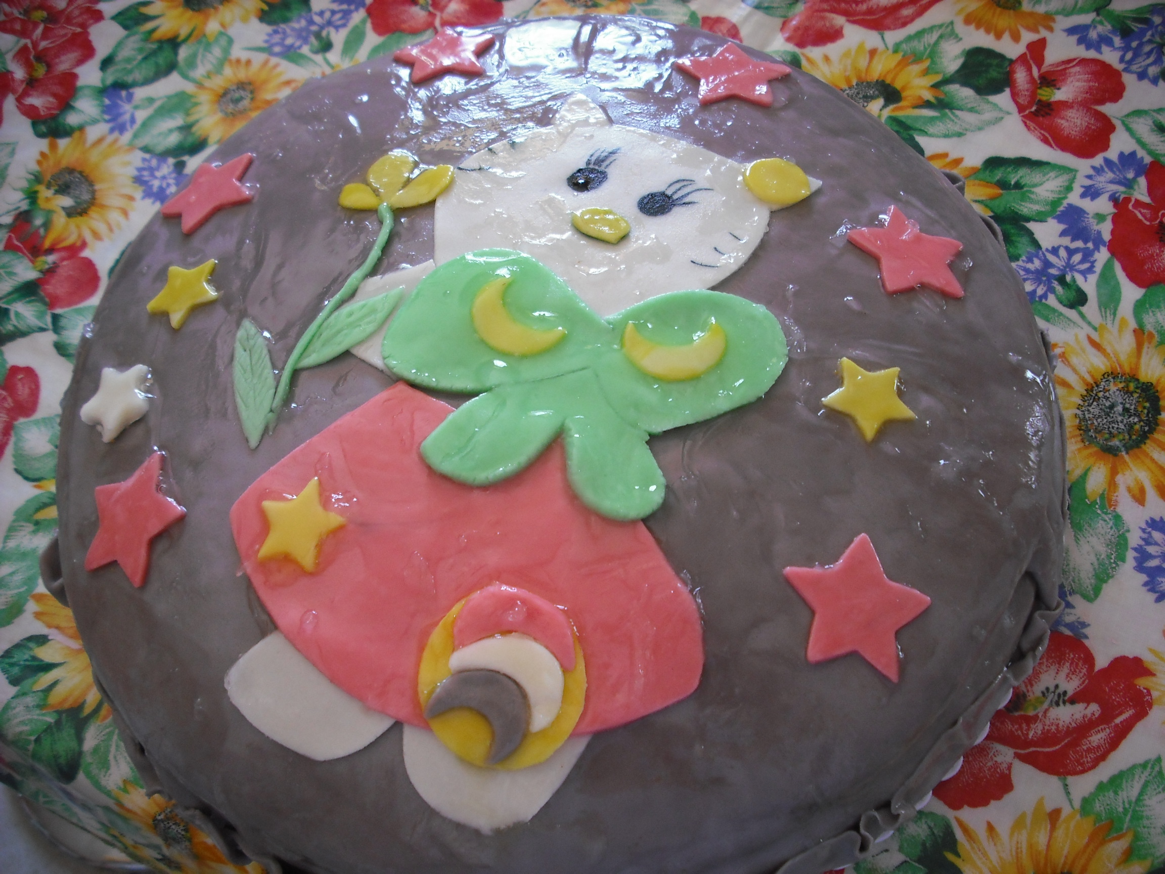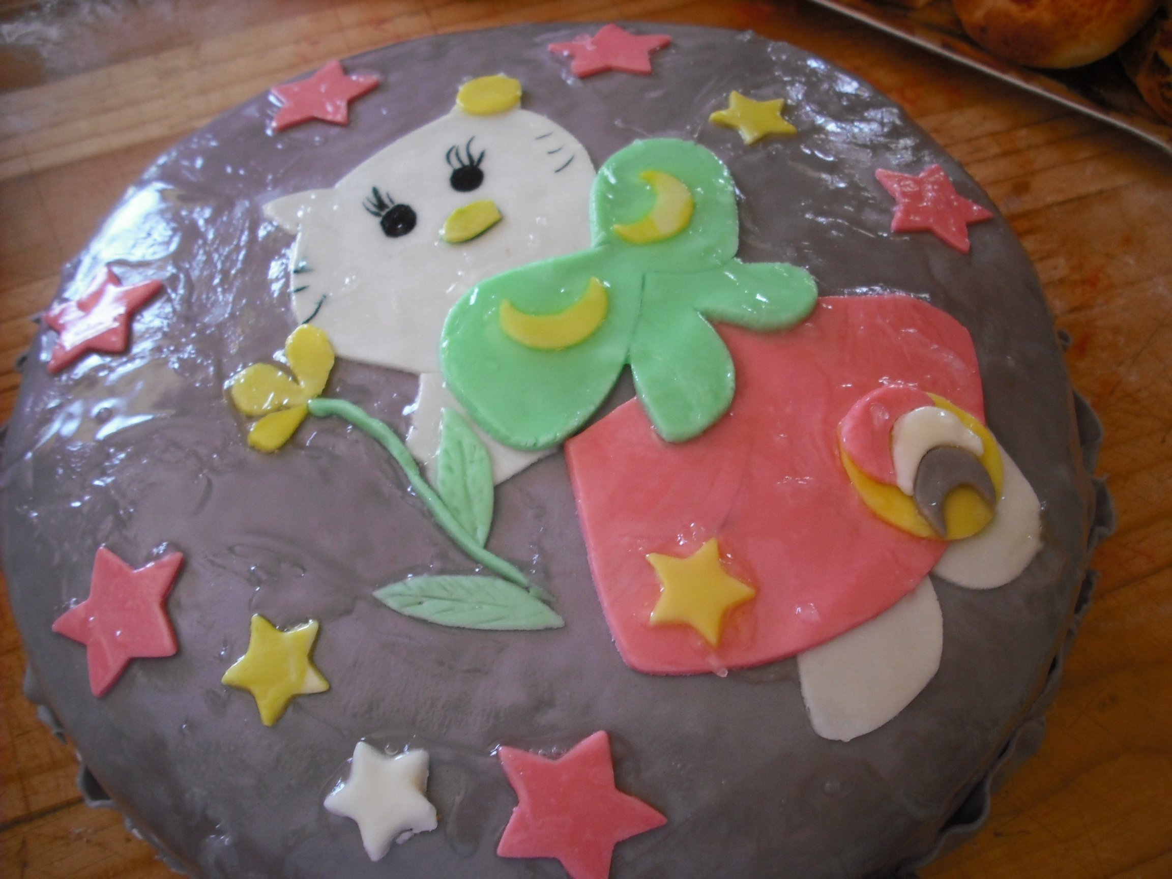In uno strato dopo averlo bagnato lo farcisco con la crema normale nell'altro ci metto la crema al cocco sopra nell'ultimo strato di pan di spagna lo pennello con la marmellata di albicocche calda e dopo metto sopra la pdz e eseguo il disegno