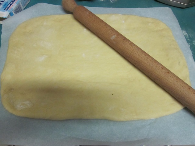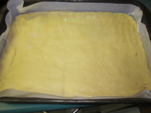 riprendere la pasta e senza rilavorarla stenderla e sistemarla in uno stampo rettangolare da 12 porzioni (30x40 cm). rimettere a lievitare nel forno spento fino al raddoppio ( 1 ora circa ).