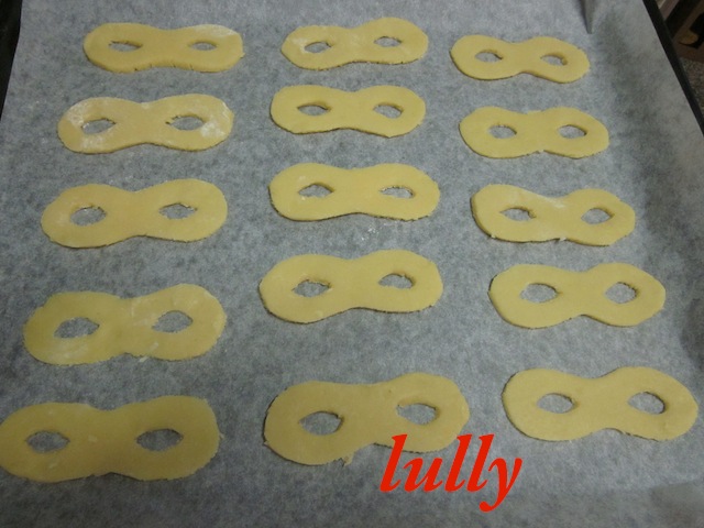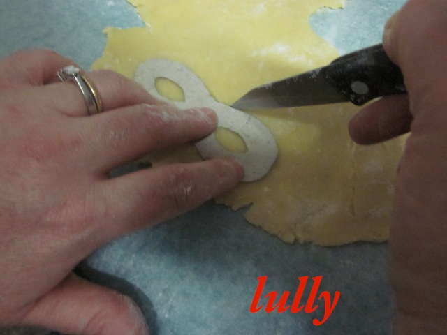 stendere la pasta dello spessore di circa 1 cm e ritagliare le mascherine, posizionarle sulla placca del forno ricoperta con l'apposita carta e cuocere in forno a 180° per  10-12 minuti. (regolatevi sempre col vostro forno!!!).