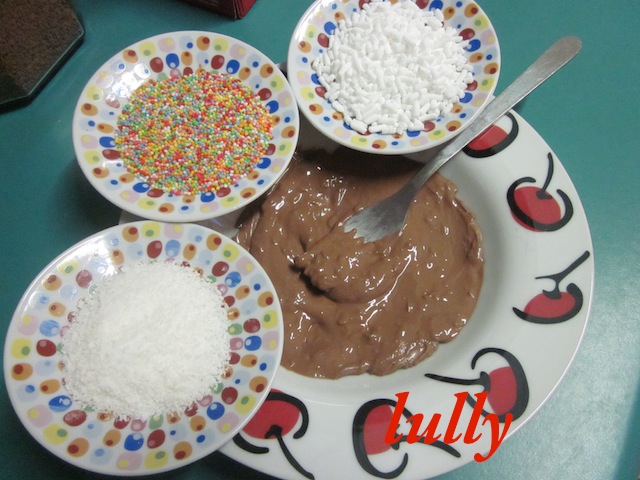 lasciar raffreddare le mascherine  poi  decorarle con il cioccolato aiutandovi con un pennellino, passare subito nei confettini, nella granella o nella farina di cocco .