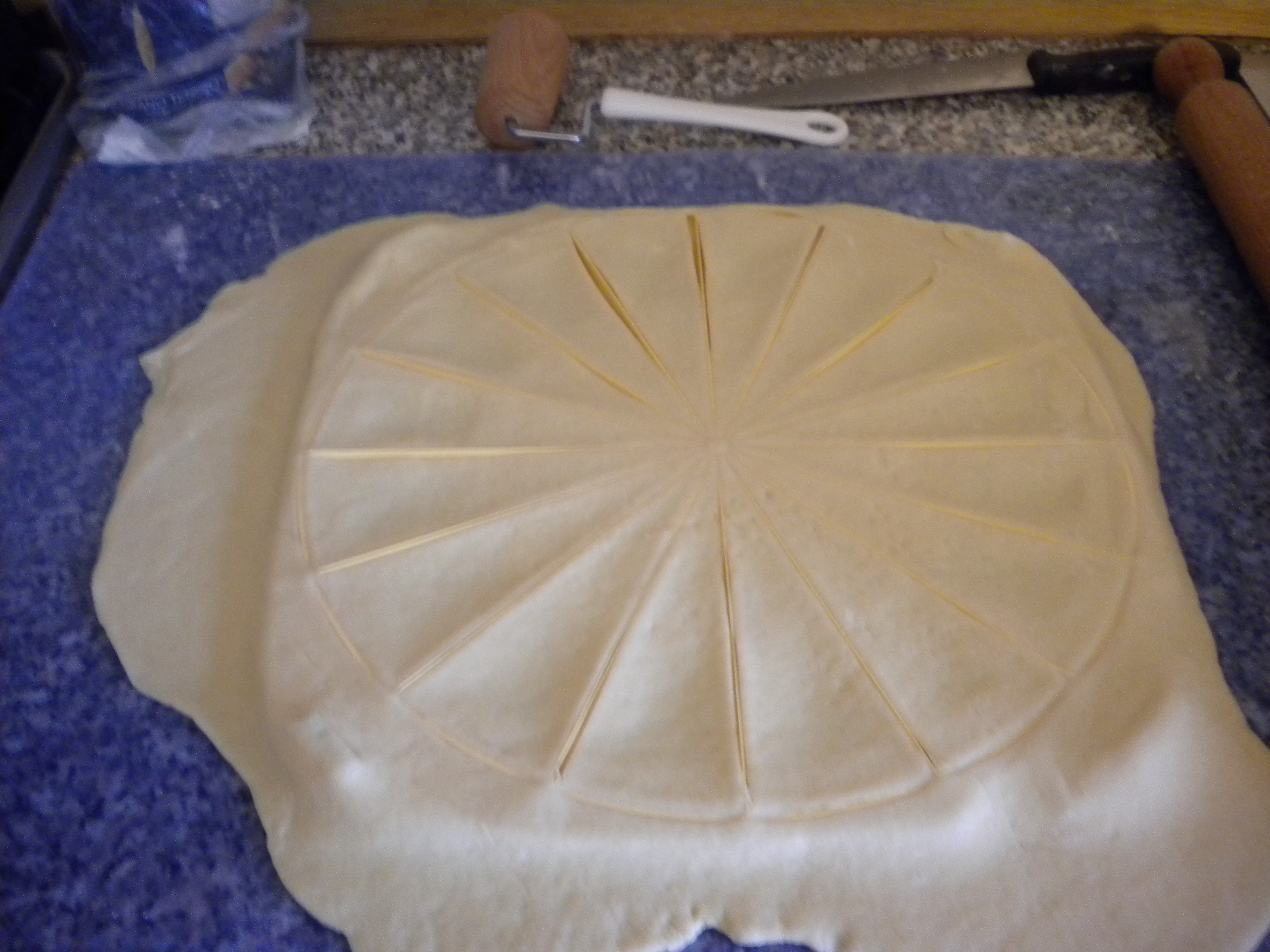 parti dal lato più largo e li giri su se stessi fino ad arrivare alla punta cercando se puoi di stringere un po di più alle estremità per chiudere bene in modo che non fuoriesca il ripieno purtroppo non ho la foto del mentre arrotolo ( se arrotolo non fotografomi vergogno a chiedere...ma mi dite ilprocedimento per chiudere i cornetti??? arrotolarli come ?!