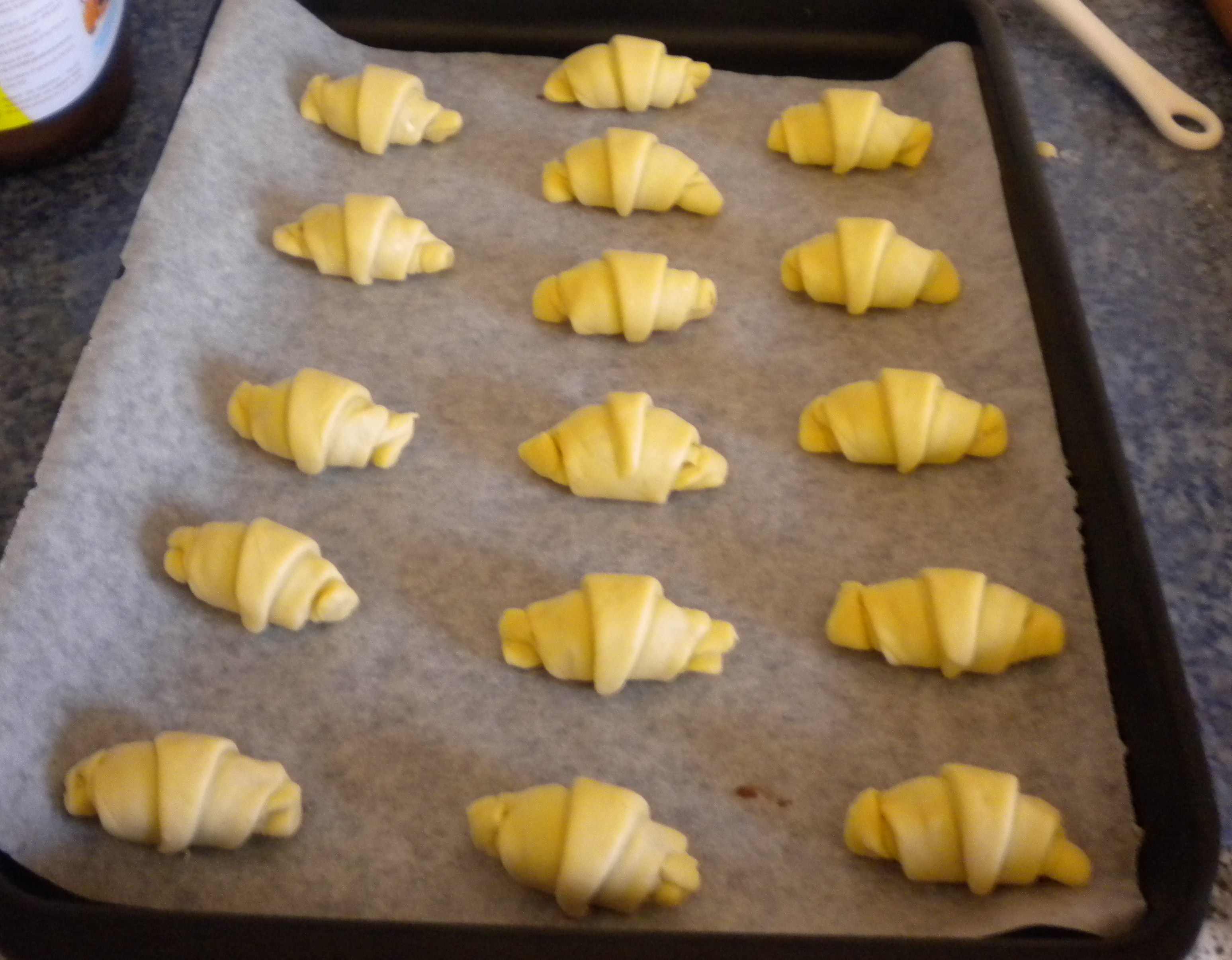 ho provato a farli da principiante, incuriosita. dunque a me sono venuti grossini, 24 cornetti. sono proprio biscottati e consiglio di mangiarli in due giorni perchè poi diventamo possi. buoni ma io preferisco i cornetti sfogliati del bar