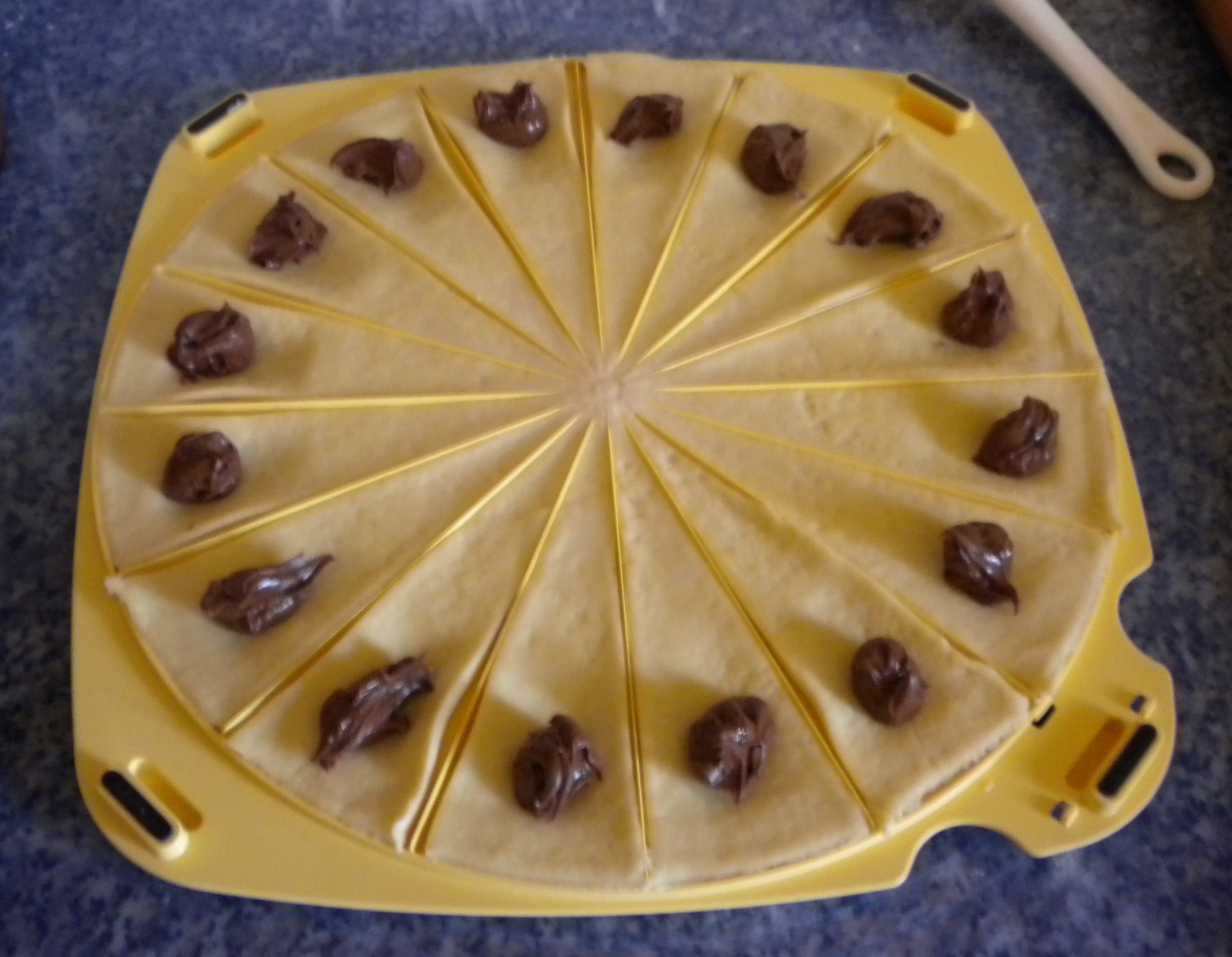 "velocità spiga" . Passare sulla spianatoia dividere in due panetti, stendere ad uno spessore di circa 3 mm,aiutandosi con l'apposito accessorio (se non lo si ha si puo fare anche senza basta sapersi regolare) tagliare i triangolini. Farcire con un cucchiaino di nutella (o con ciò che si preferisce), inumidire le punte e arrotolare. Disporre sulla placca ed infornare a 180° ventilato per circa 20 min. Spolverare con zucchero a velo