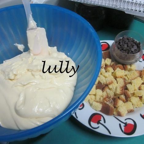 aggiungere all'impasto le gocce di cioccolato e i cubetti di pandoro o panettone, mescolare velocemente con una spatolina.