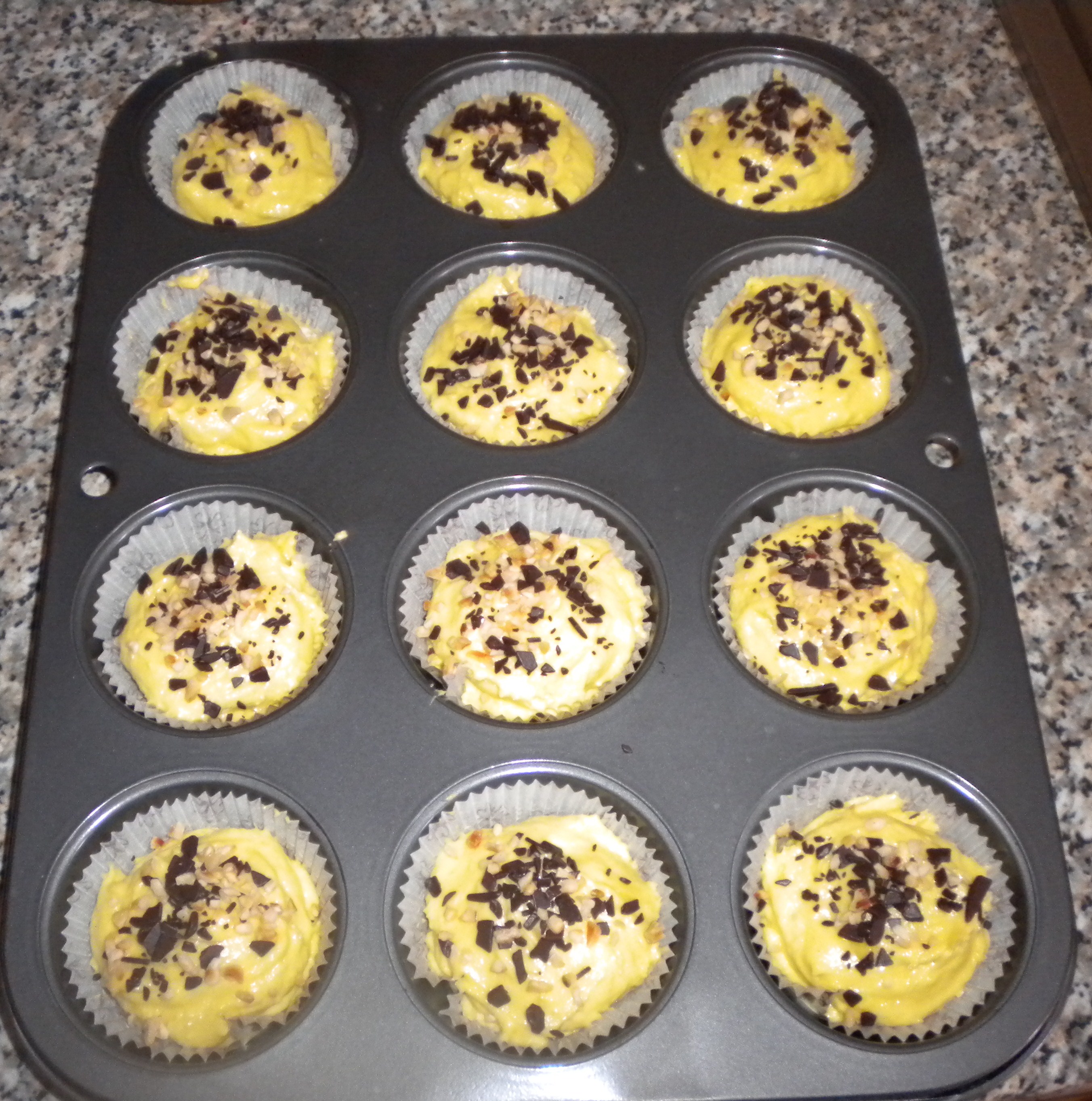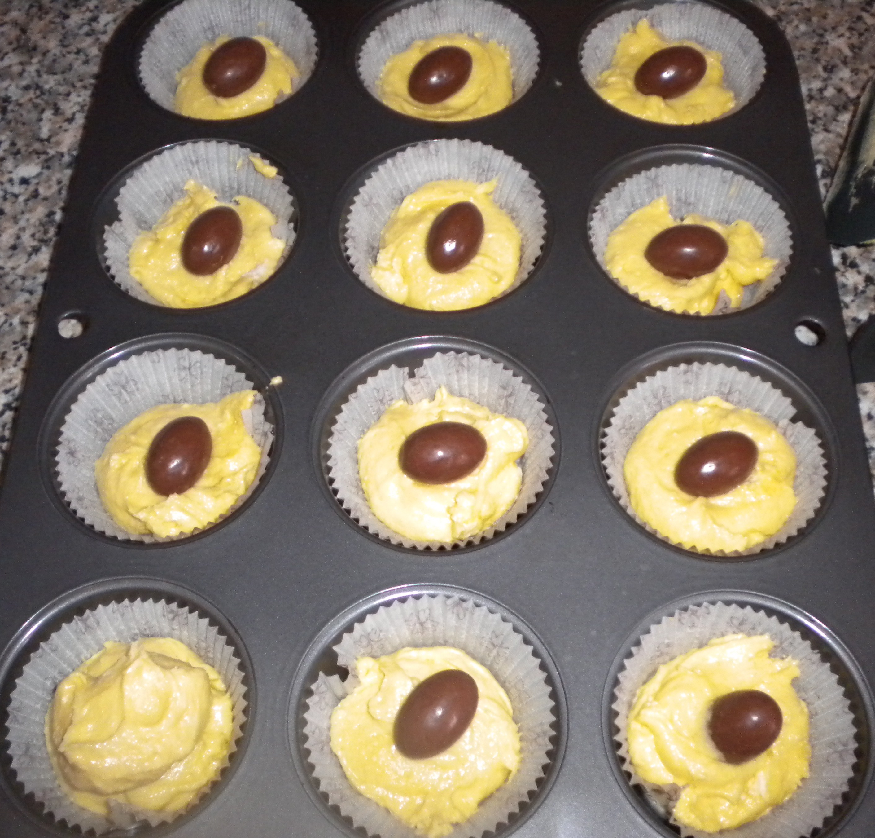 Mettere  i pirottini di carta nello stampo su ognuno mettere un bel cucchiaino di impasto, mettere gli ovetti o ciò che volete e coprire con un altro cucchiaino di impasto. Decorare con granella di nocciole e scaglie di cioccolato infornare a 180° per circa 20 min.