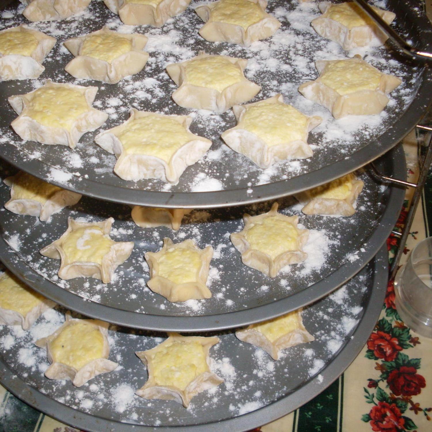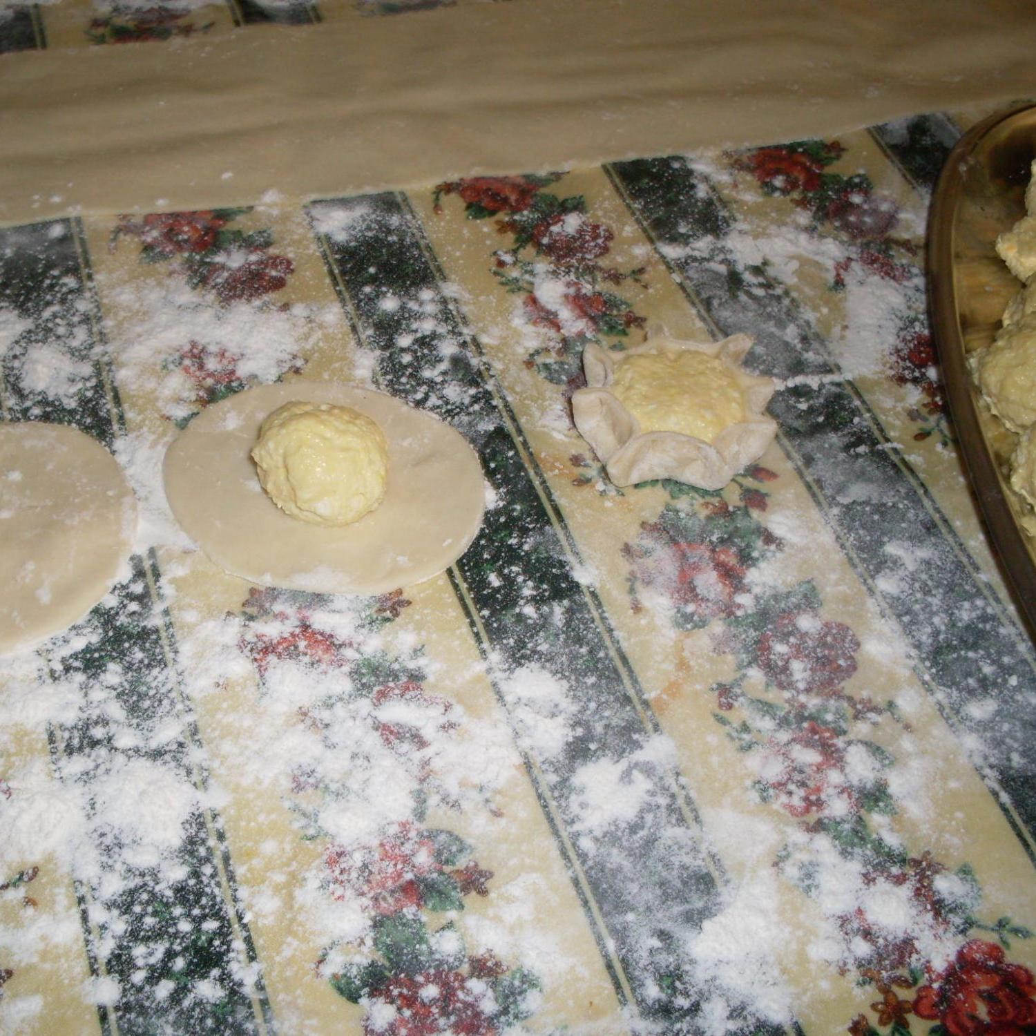 formare delle palline della dimensione di una piccola noce, metterla al centro del dischetto di pasta, arriciare con le dita con una leggera pressione sulla pasta.