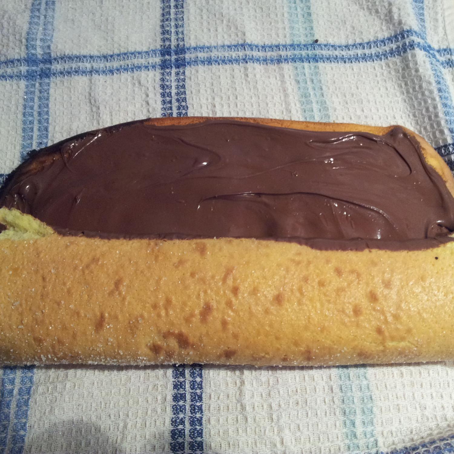 quando è cotto preparate uno strofinaccio asciutto e pulito su un piano, cospargetelo di zucchero e adagiatevi sopra la torta ( la parte appoggiata alla carta forno deve essere rivolta verso l'alto). appena fredda spalmateci la nutella sopra (o anche marmellata) abbondantemente .