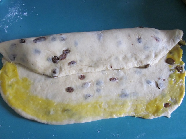 - Pennellare i bordi con il tuorlo e ripiegare i due lati di pasta più lunghi verso il centro in modo da coprire il marzapane;