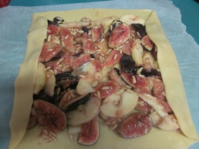 in una ciotola unire le mele, i fichi, i pinoli, lo zucchero e la cannella, mescolare gli ingredienti tra loro e metterli da parte.