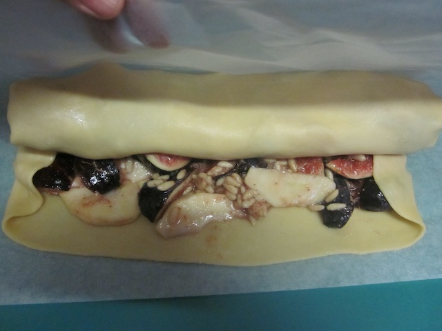 ripiegare i lembi più corti della pasta, poi avvolgere lo strudel su se stesso servendosi della carta forno, dare la classica forma di ferro di cavallo.