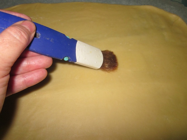 stendere la pasta su di un foglio di carta forno, formare un rettangolo il più sottile possibile poi spennellarlo col burro fuso.