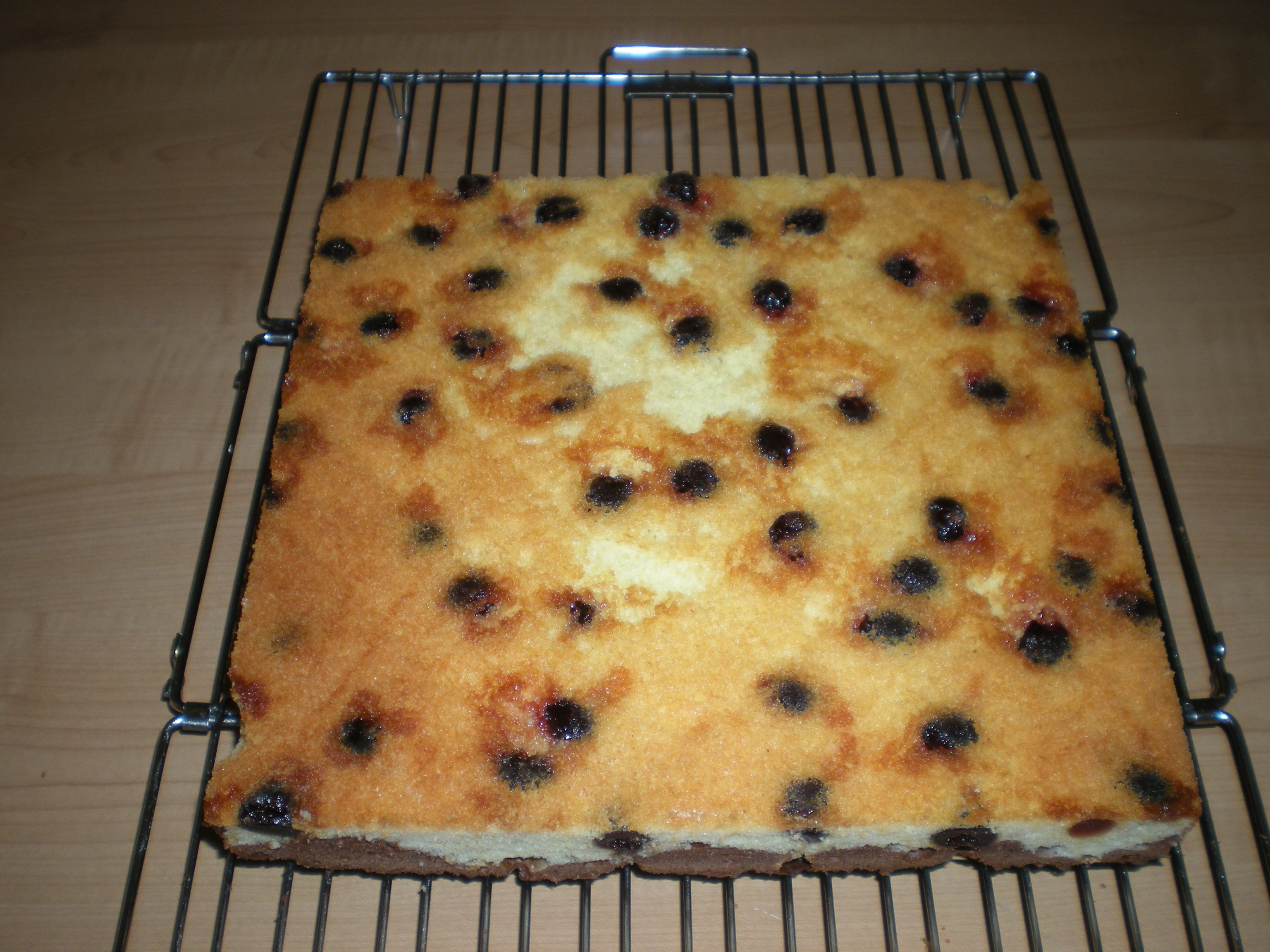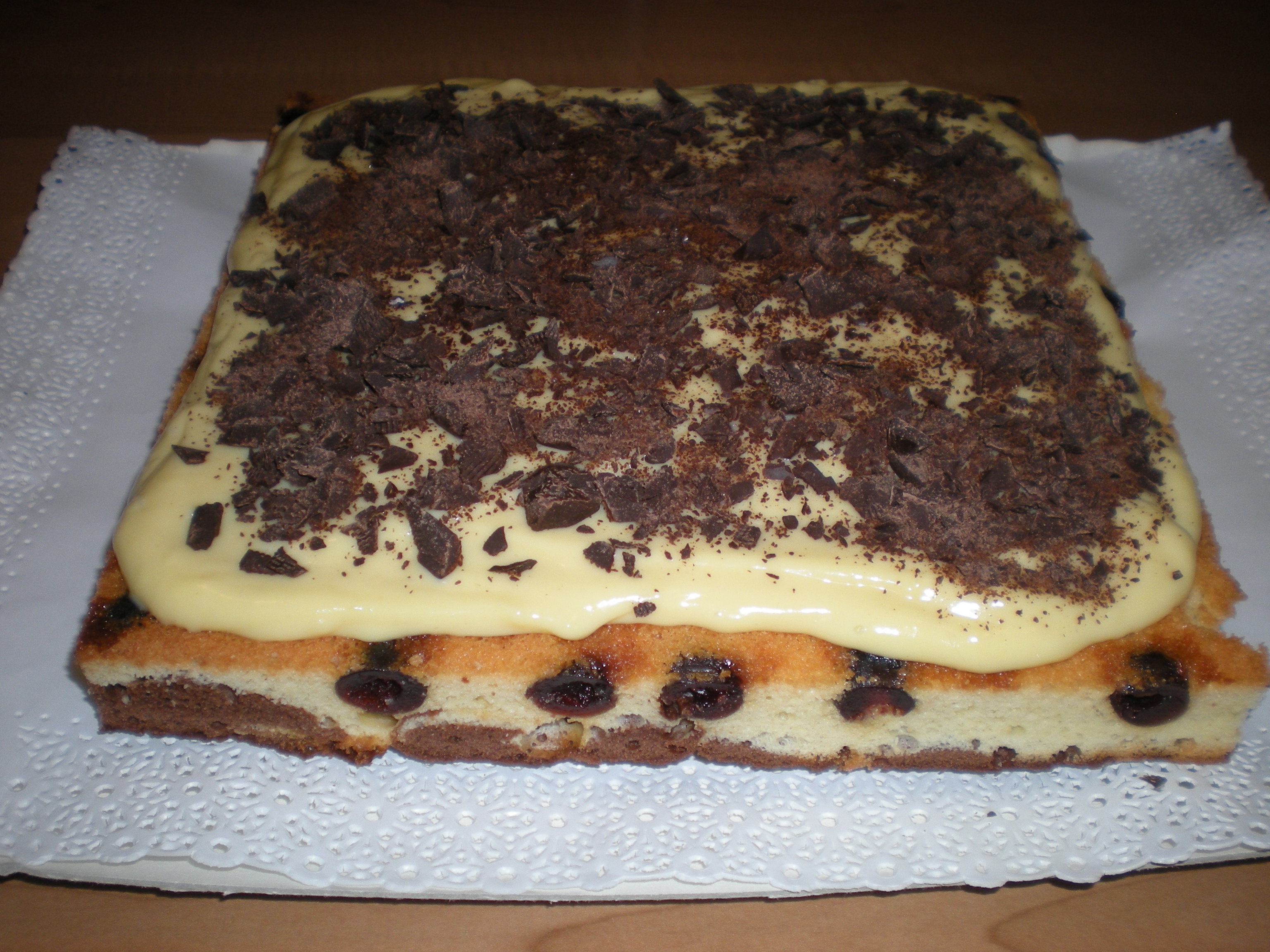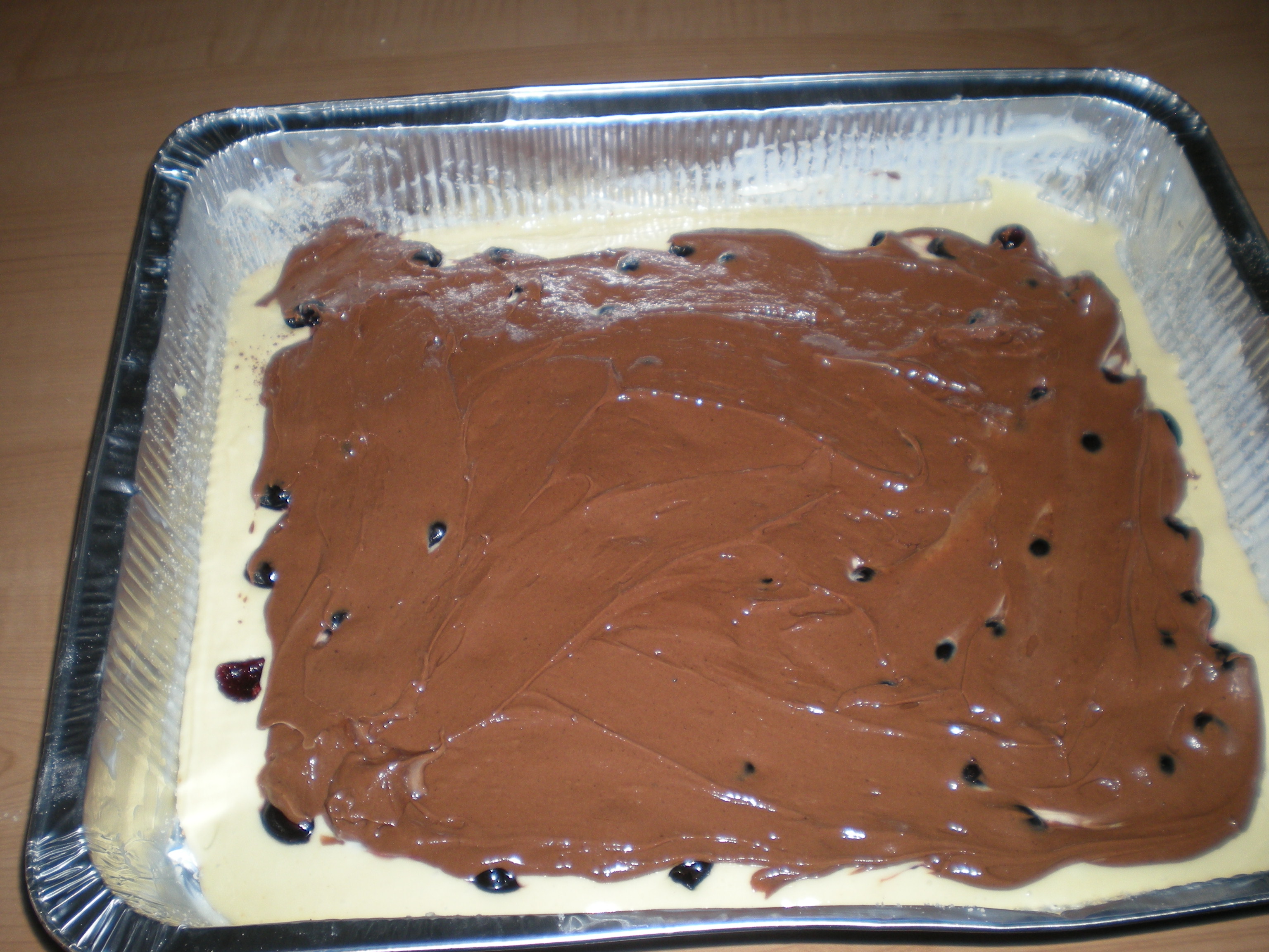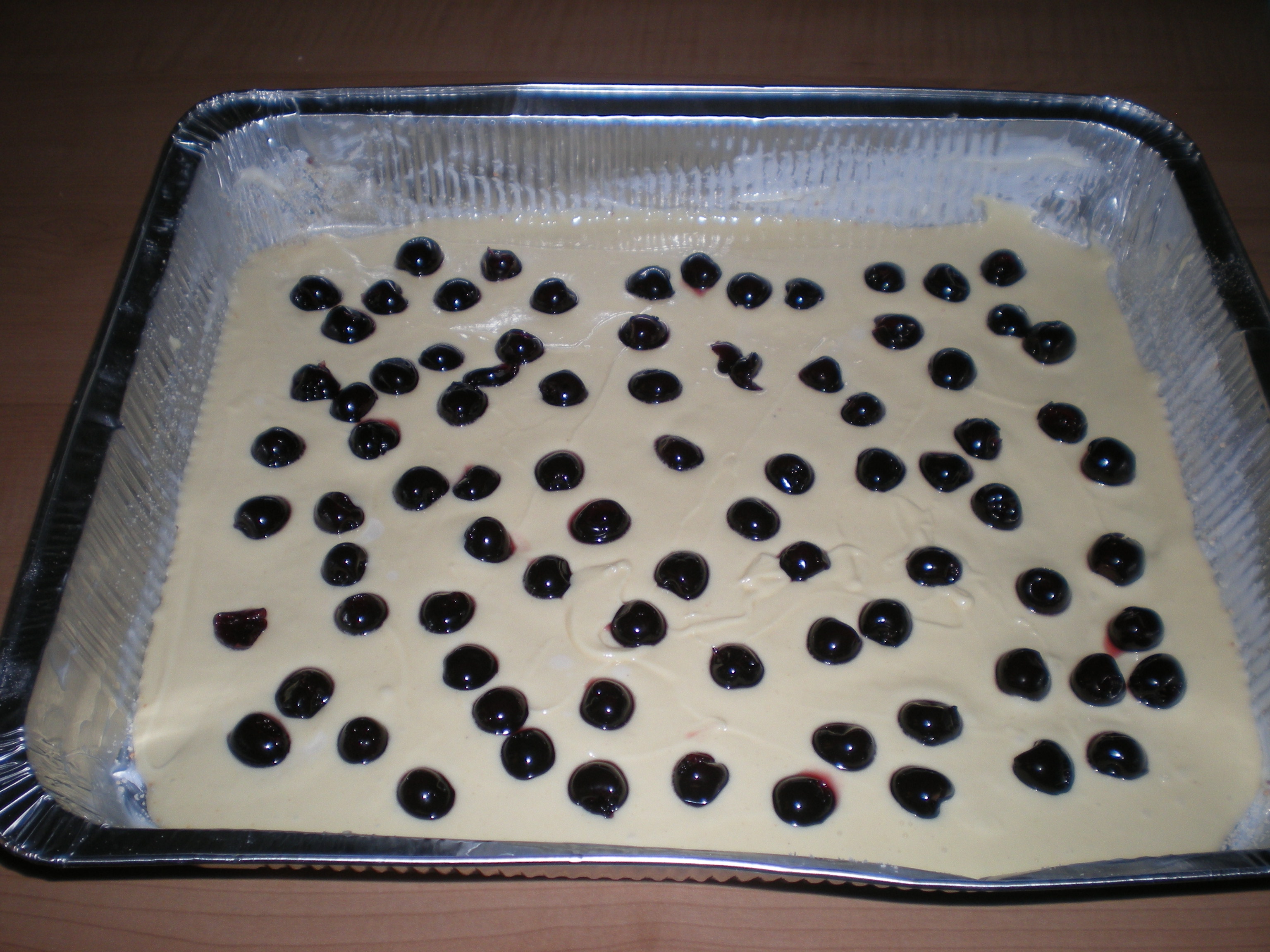 Metti 1/2 composto in una teglia quadrata unta con il burro e cosparsa di pangrattato, poi disponi sul composto le ciliegie sgocciolate.