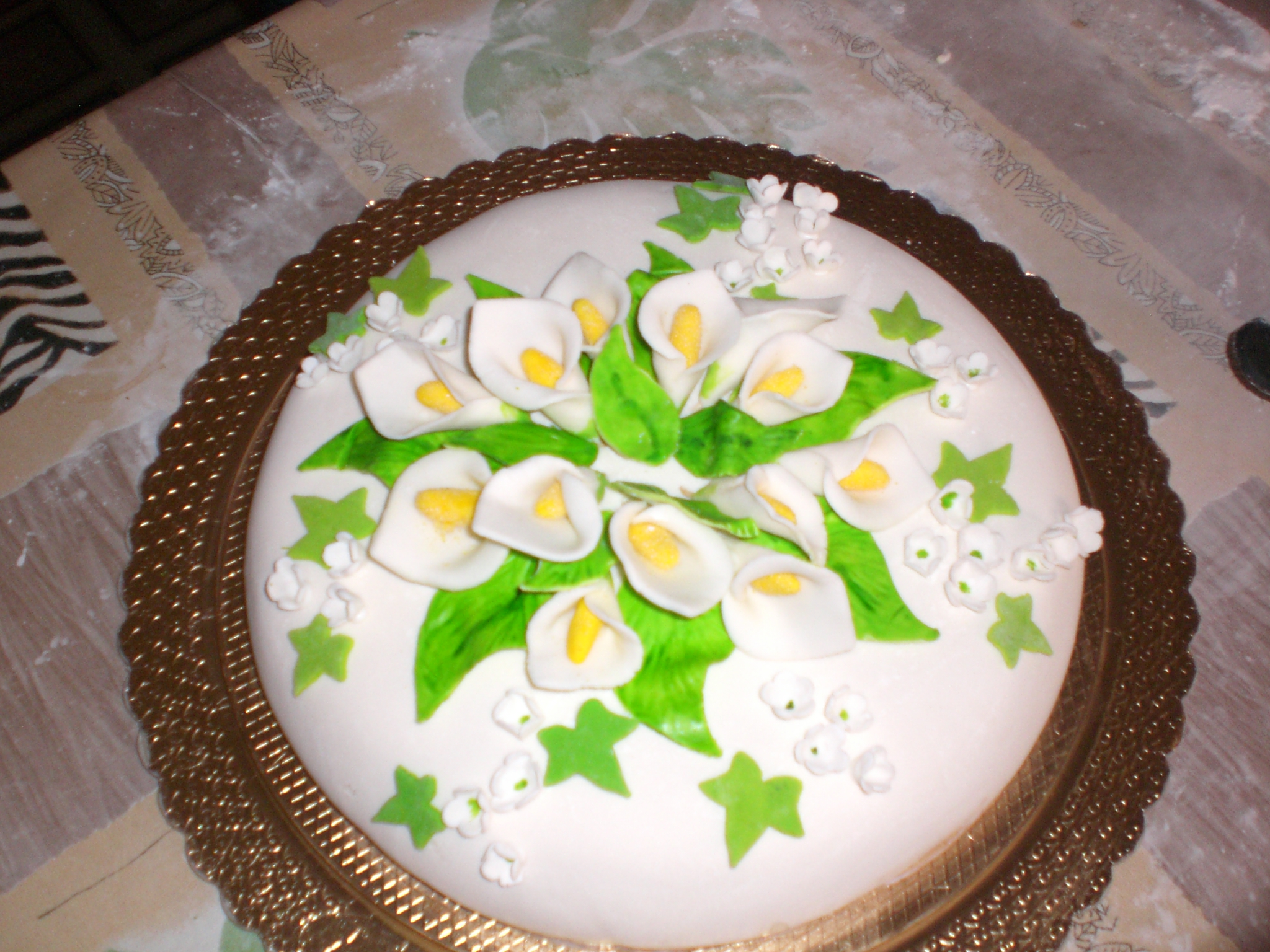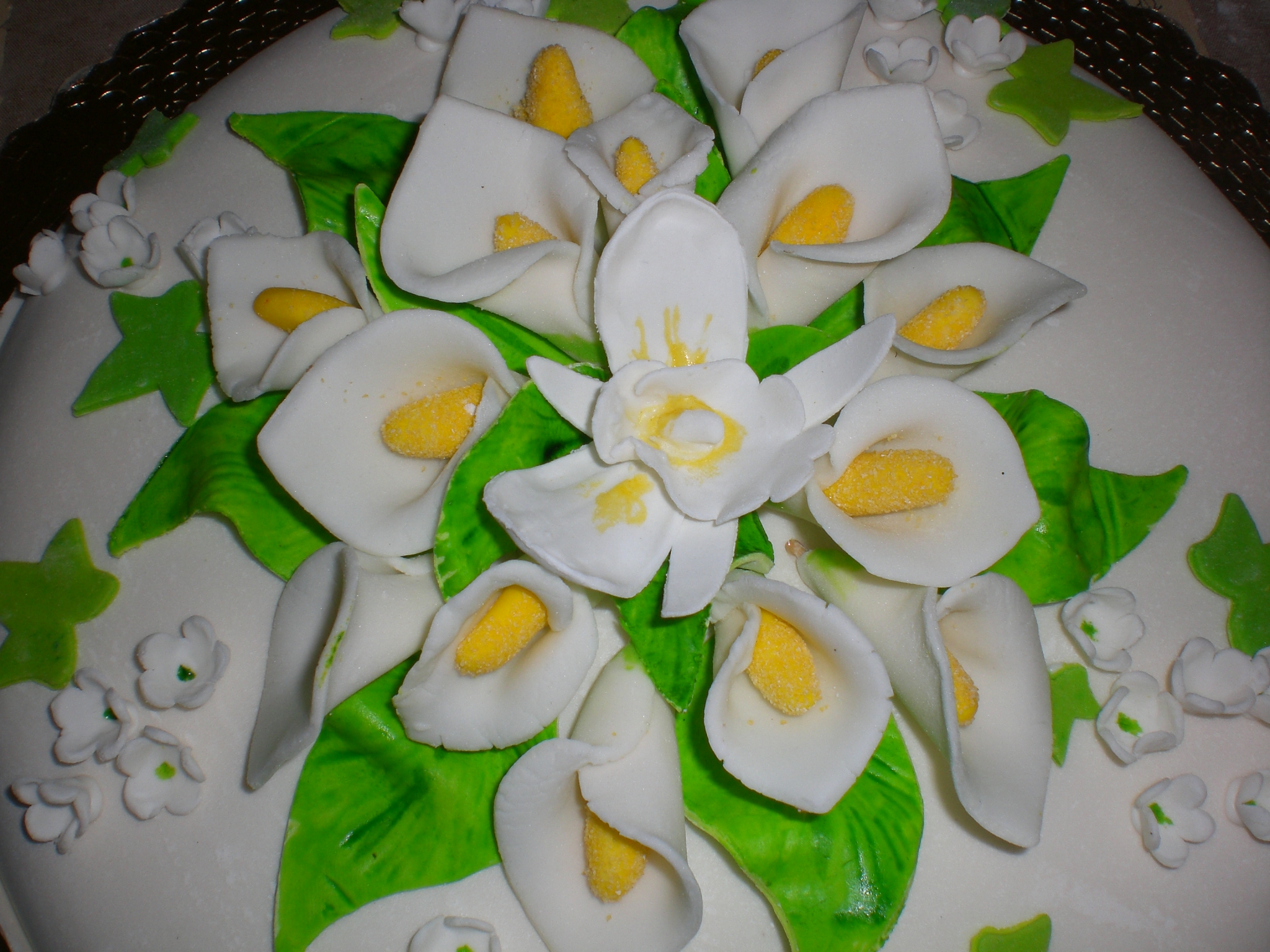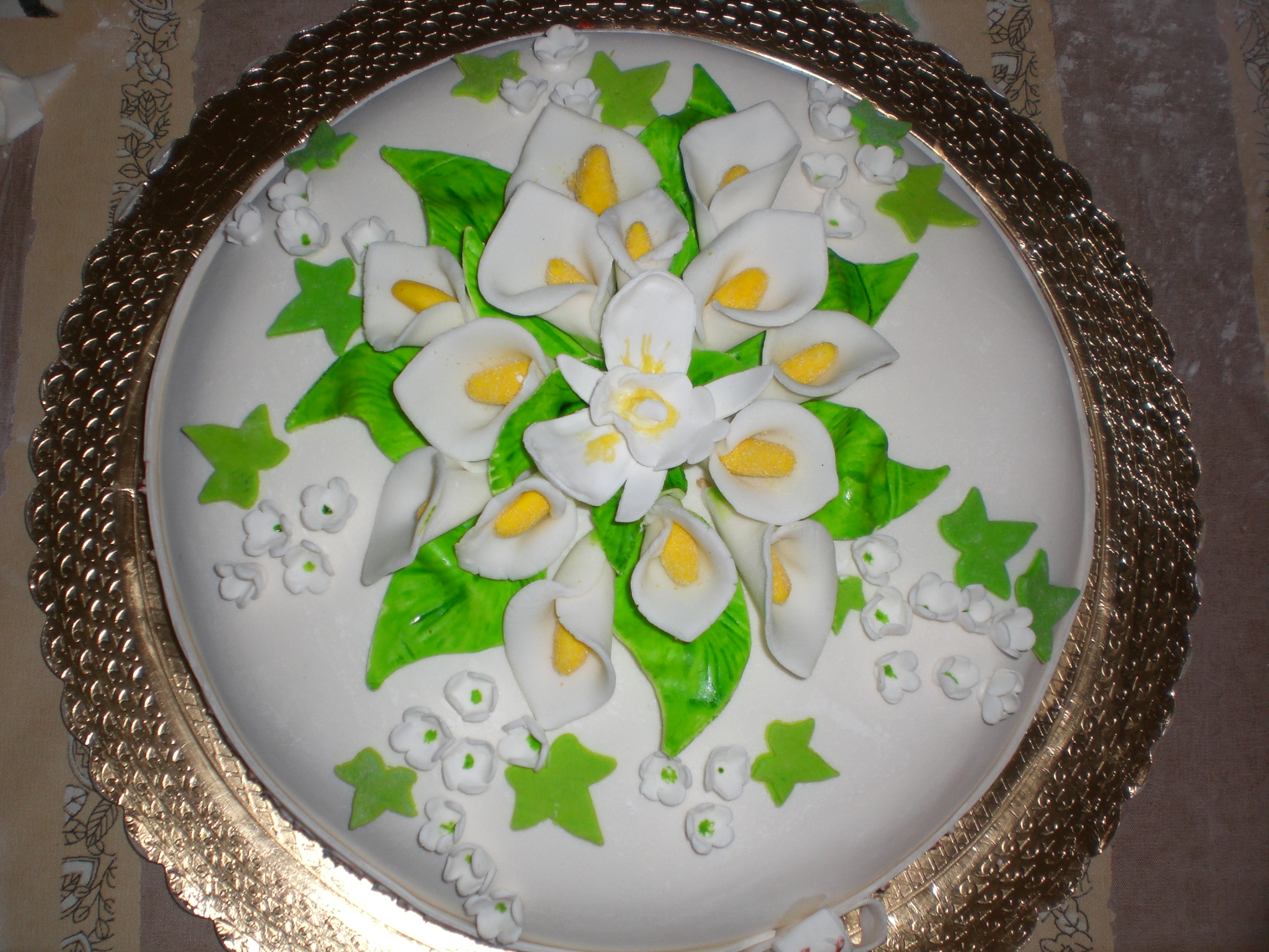 con la pasta di zucchero ho creato utilizzando degli stampi, le calle, le foglie i fiori di mughetto e l'orchidea.