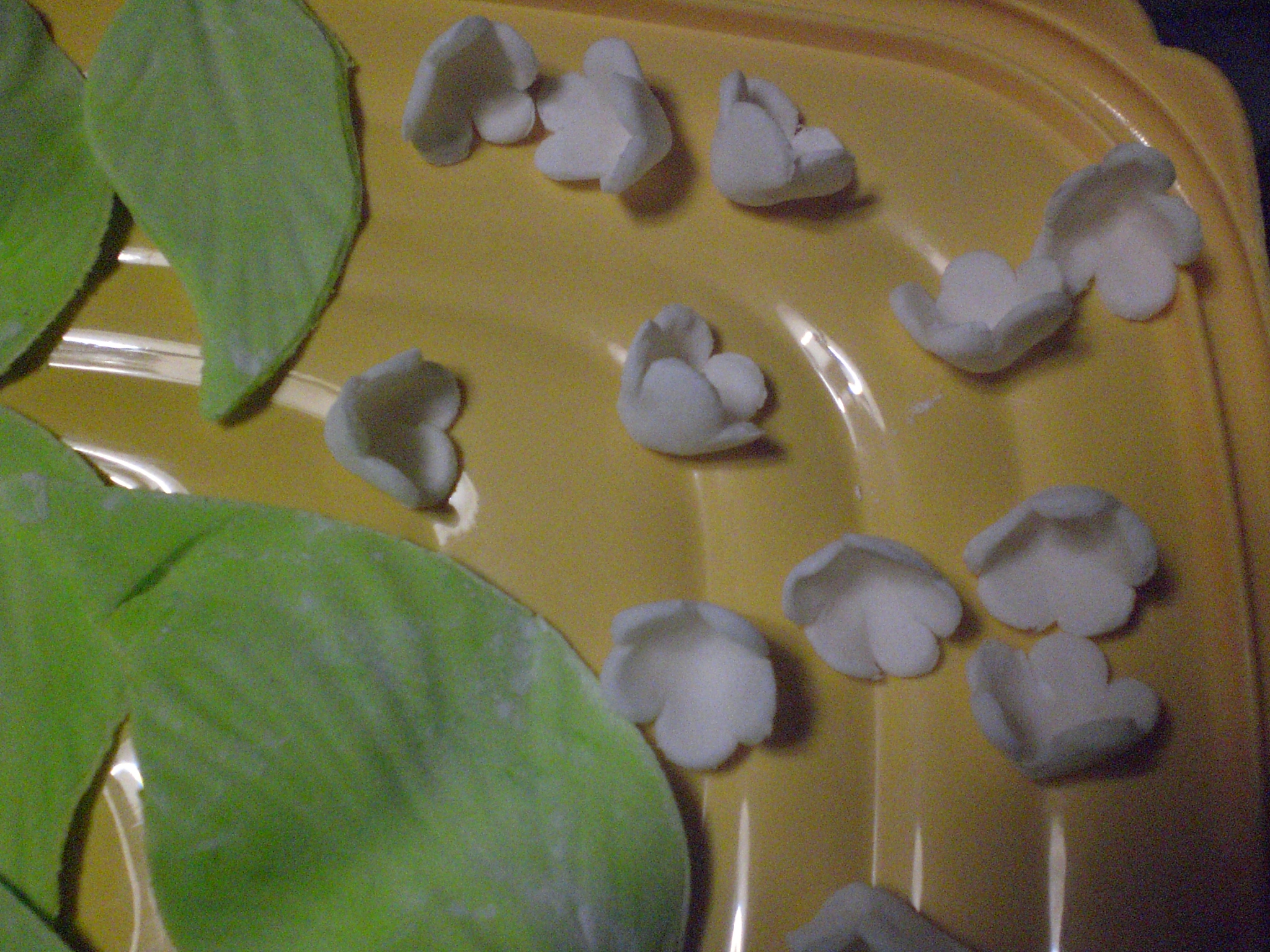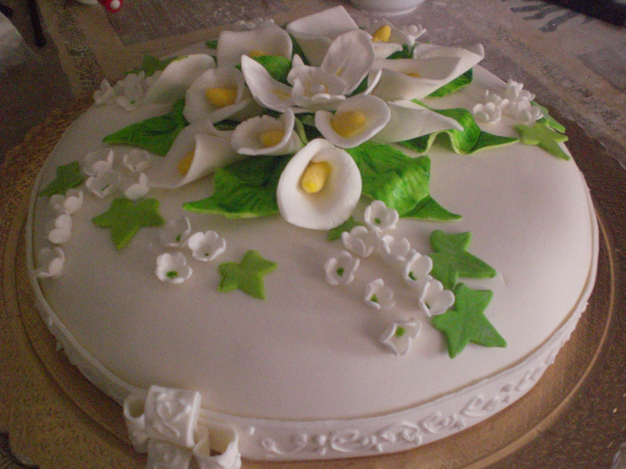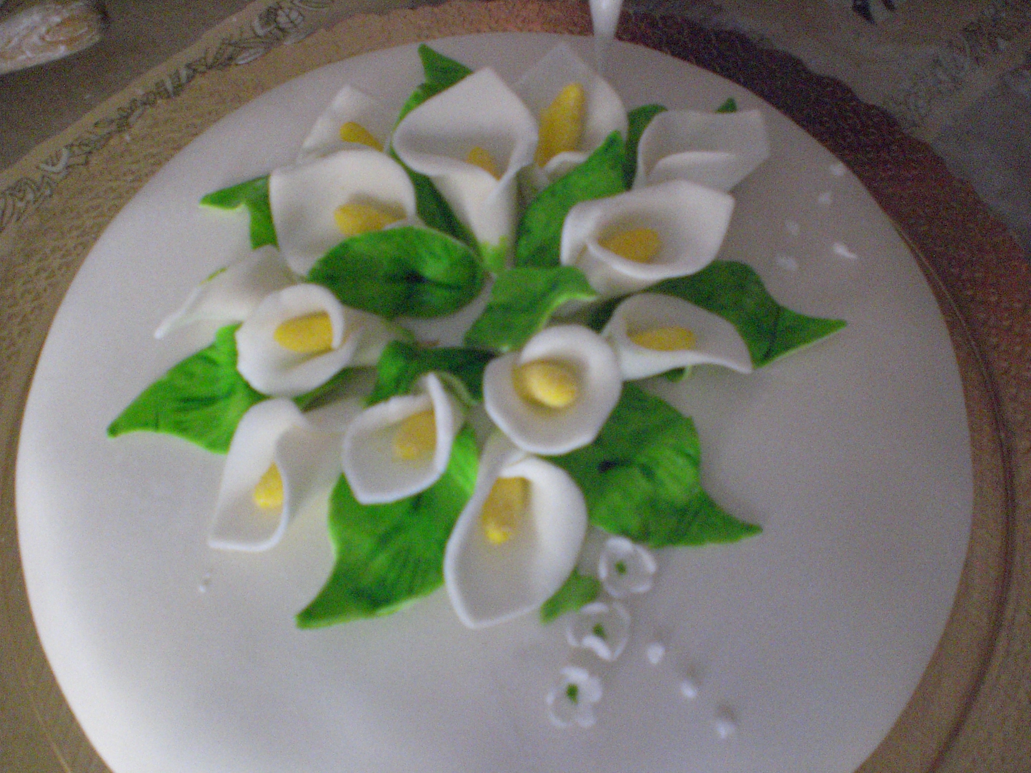 con la pasta di zucchero ho creato utilizzando degli stampi, le calle, le foglie i fiori di mughetto e l'orchidea.