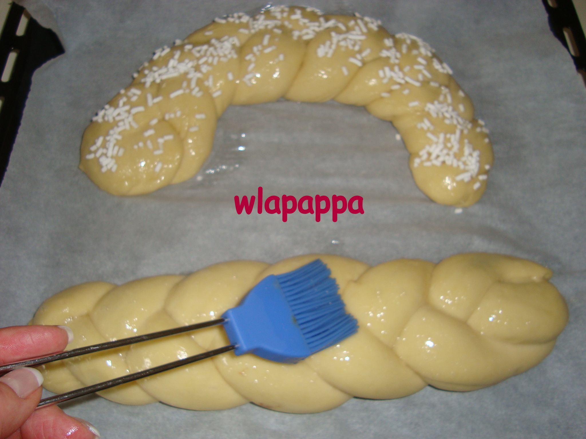 Accendere il forno a 180° ventilato e nel frattempo pennellare la treccia con l'albume sbattuto in una ciotolina e mischiato a 2 cucchiai di zucchero a velo. Decorare con la granella di zucchero e mettere in forno. Fare attenzione se tende a colorirsi troppo mettere sopra un foglio di alluminio.