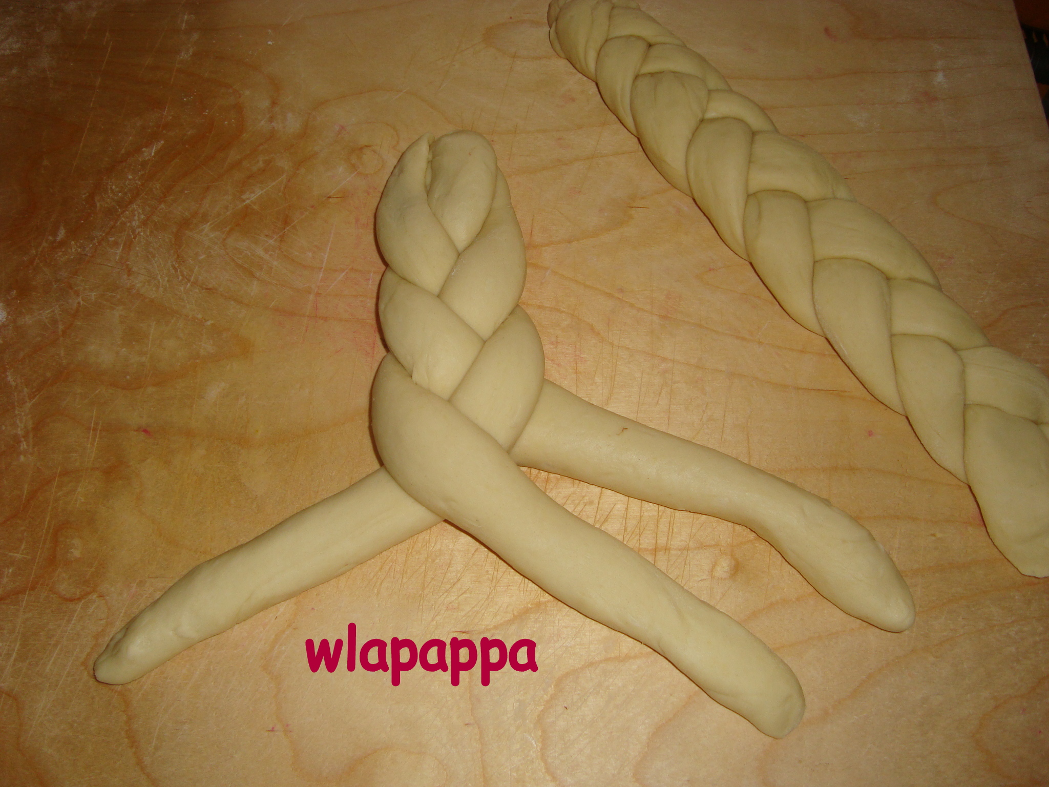 Dividere l'impasto in 3 pezzi di uguali dimensioni e lavorare su di un piano infarinato formando 3 cilindri. Intrecciarli formando la treccia e rimettere a lievitare ancora per un'oretta.
