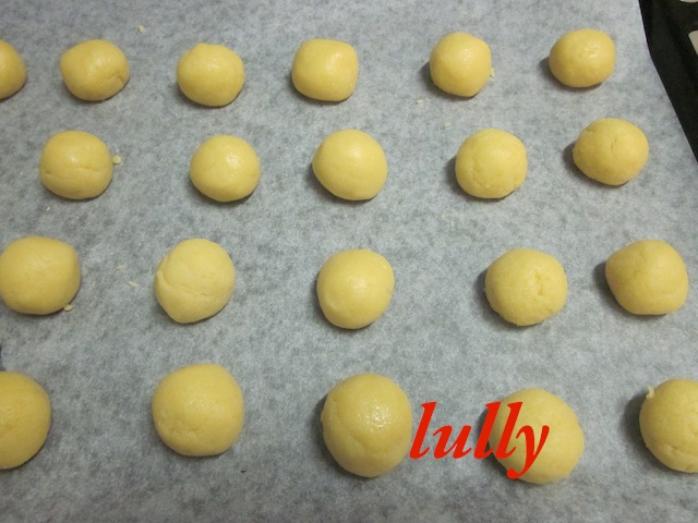 togliere la pasta dal boccale, sistemarla con un pò di farina se occorre, poi formare tante palline grandi come una noce e posizionarle sulla placca del forno rivestita con l'apposita carta.