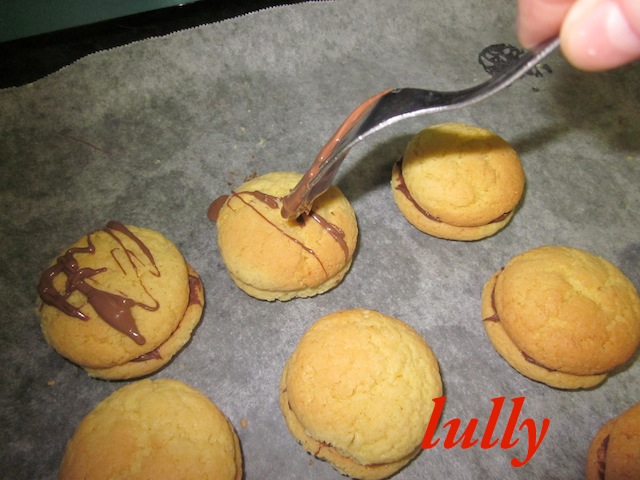 con i rebbi di una forchetta prendere il cioccolato fuso e passarlo sopra agli yo-yo creando delle striscie. farlo prima da un lato, poi metterli a rassodare in frigo, girarli e decorare l'altro lato.