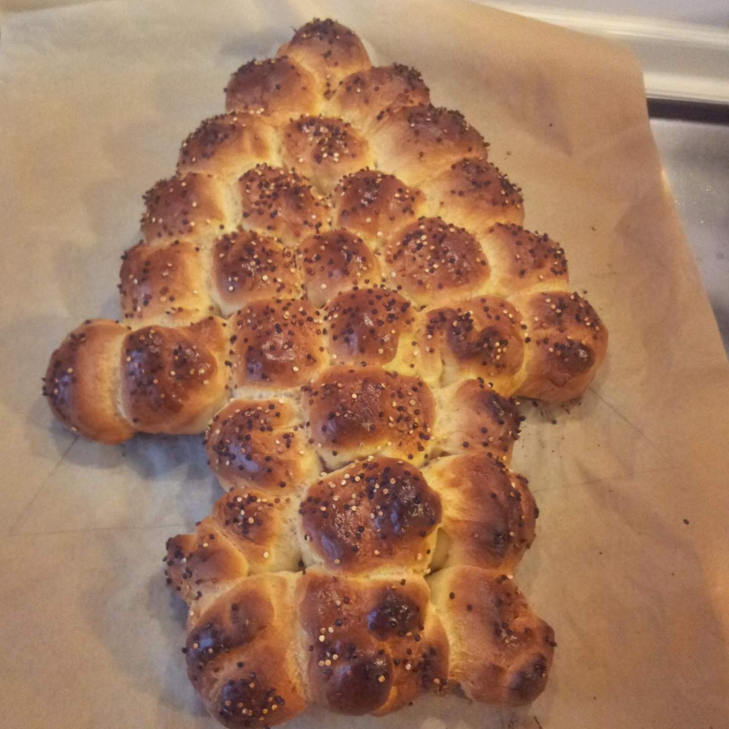 5. Dall'impasto lievitato ricavare tante palline (poco più grosse di una noce) e sistemarle sul foglio seguendo il bordo del disegno precedentemente fatto. Spennellare l'alberello con il mix di tuorlo e latte e mettere sopra i semi di papavero. Posizionare sulla leccarda.