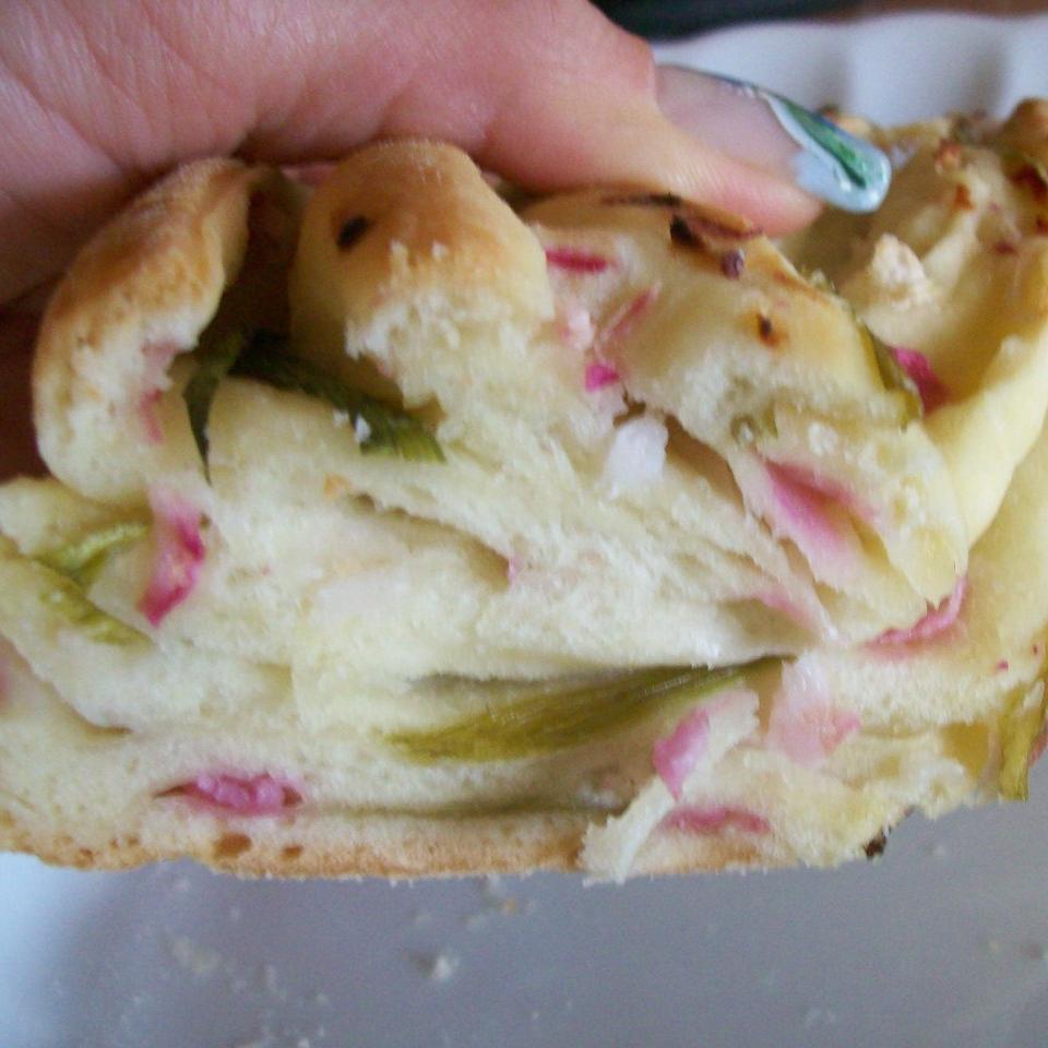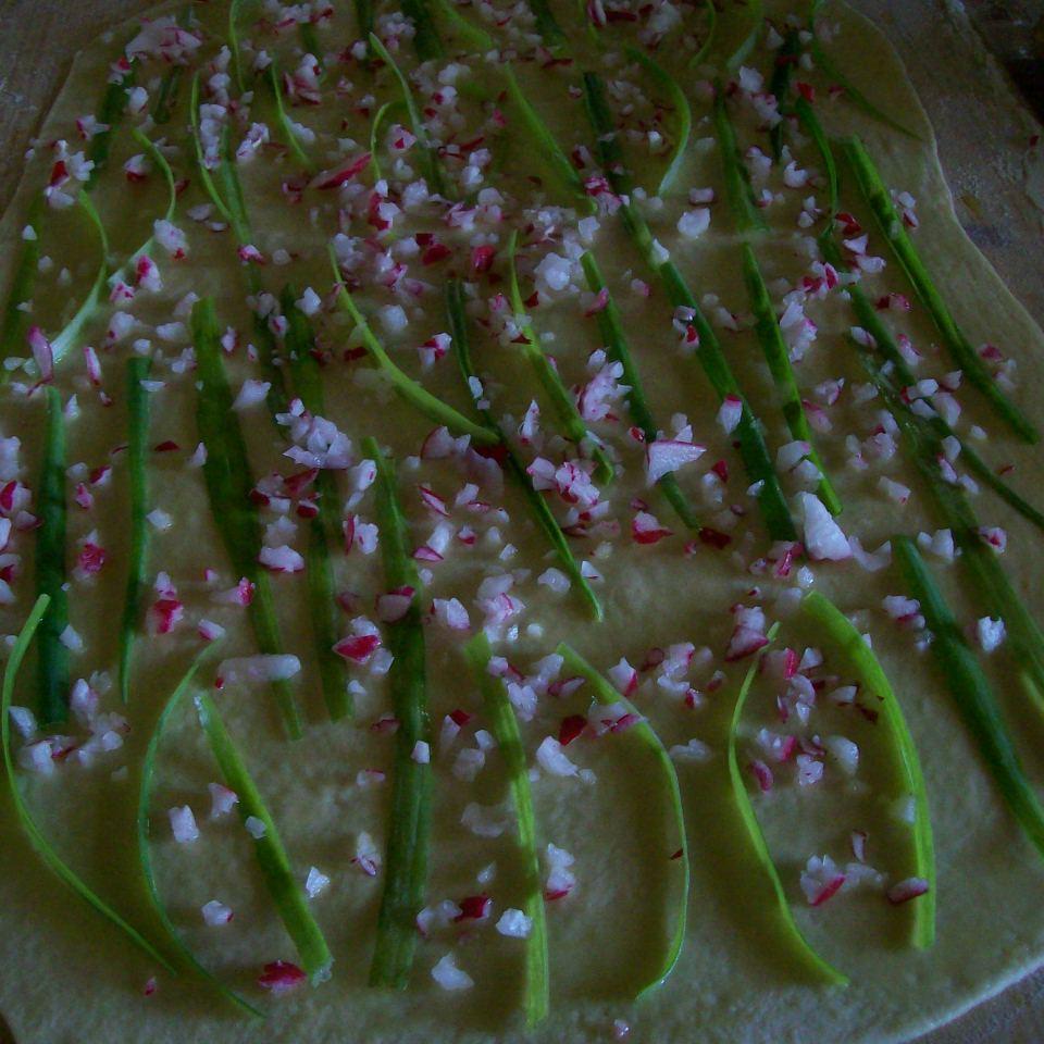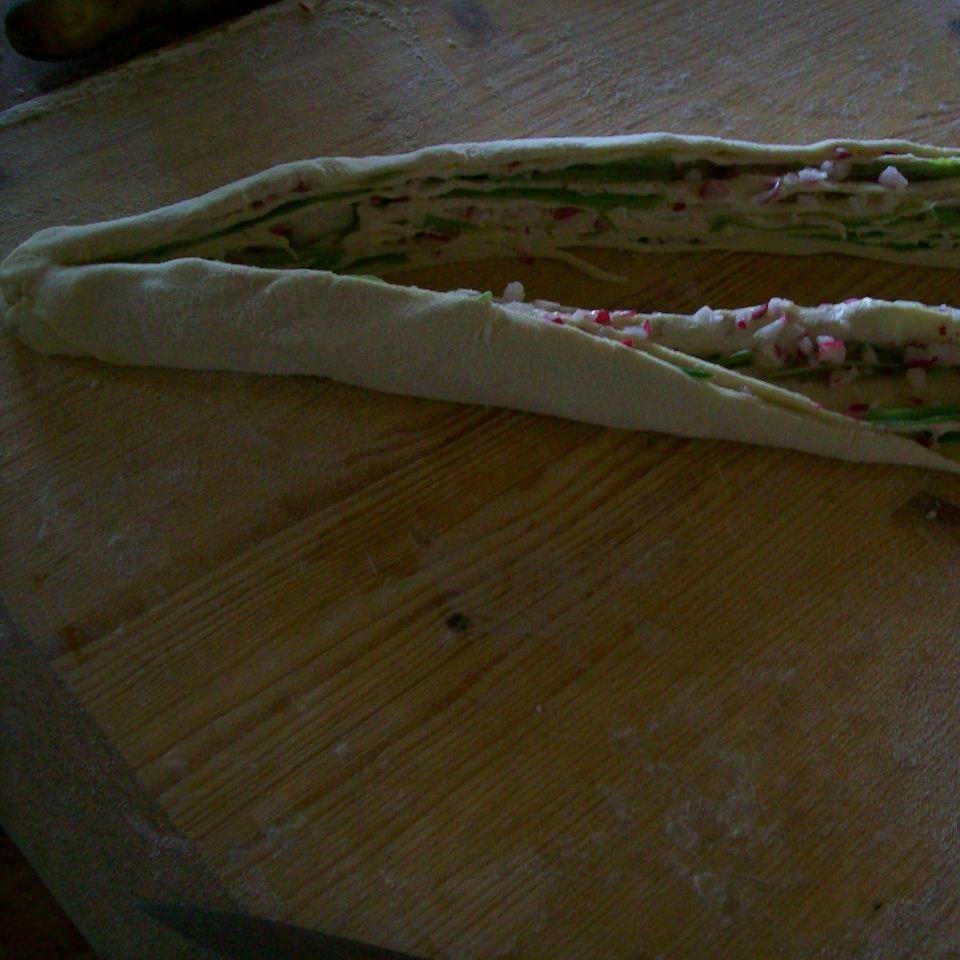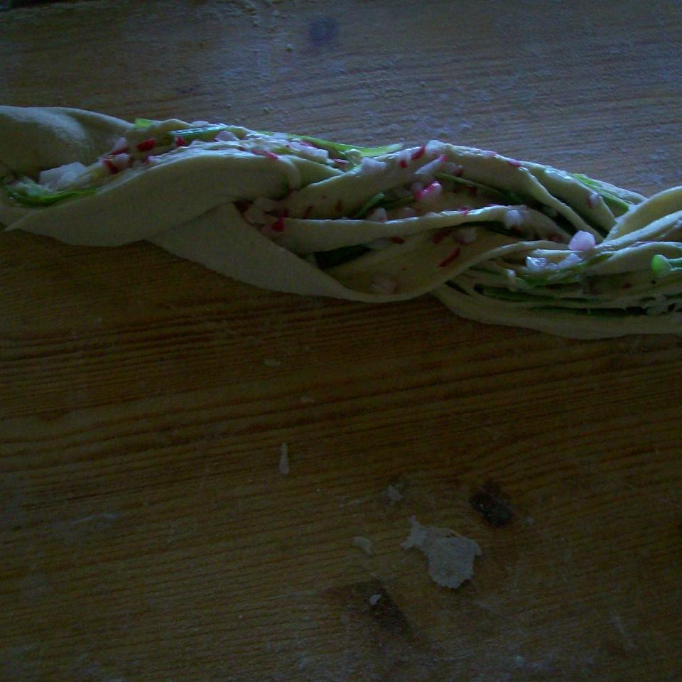 "velocità spiga" . Trasferire in una ciotola, coprire, lasciare a lievitare fino a raddoppio ( 1h circa). Intanto preparare il ripieno: lavare ed asciugare l'erba cipollina, tagliarla a fettine sottili nel senso della lunghezza. Lavare i ravanelli, tagliarli a pezzi: 10sec / vel 4. Stendere l'impasto, spennellarlo di olio, sistemarvi l'erba e i ravanelli. Arrotolare il tutto, tagliare il rotolo a metà, lasciando intatto l'inizio ( 2cm circa). Intrecciare, come ANGELICA, spennellare ancora con l'olio, lasciare a riposare per 30min. Cuocere nel forno caldo: 180° / 20-25min circa. Togliere dal forno, dare un'altra spennellata di olio.
