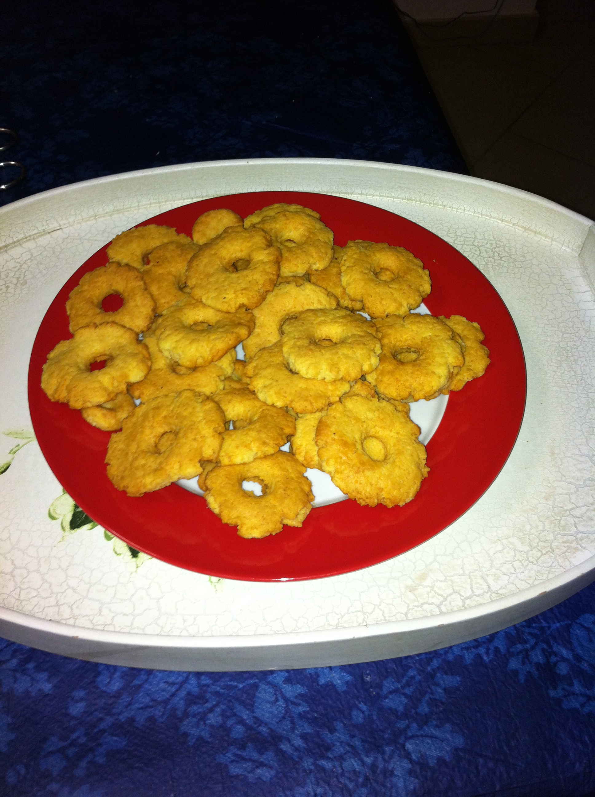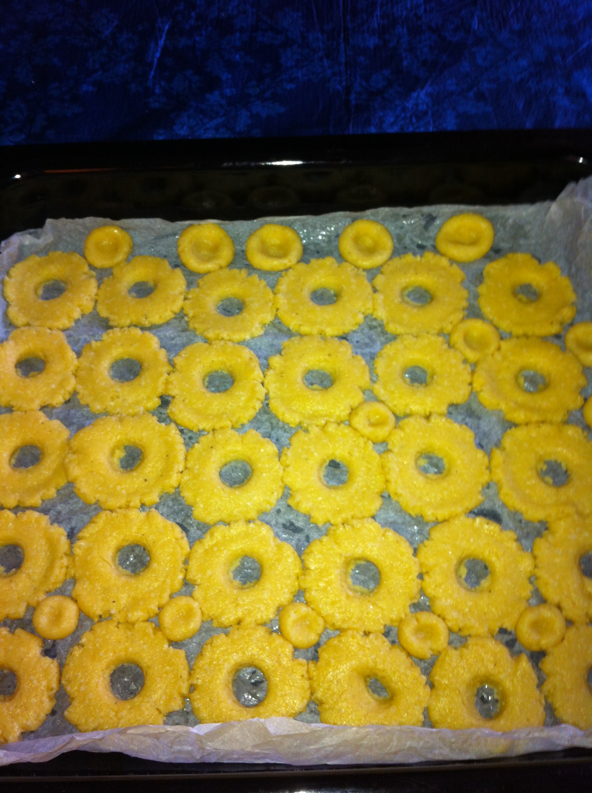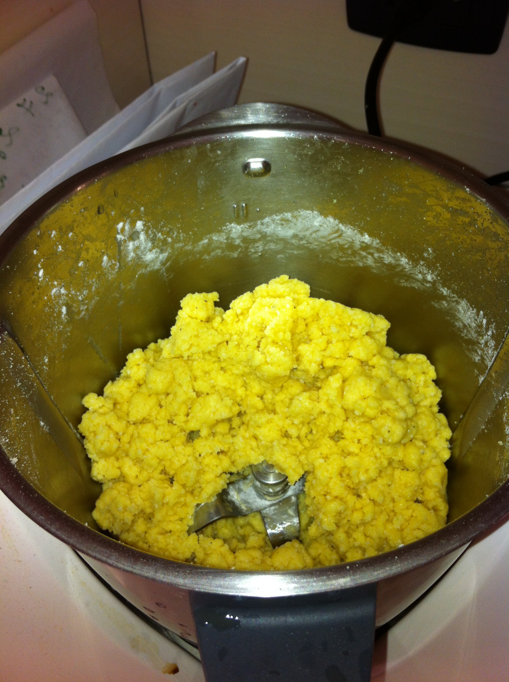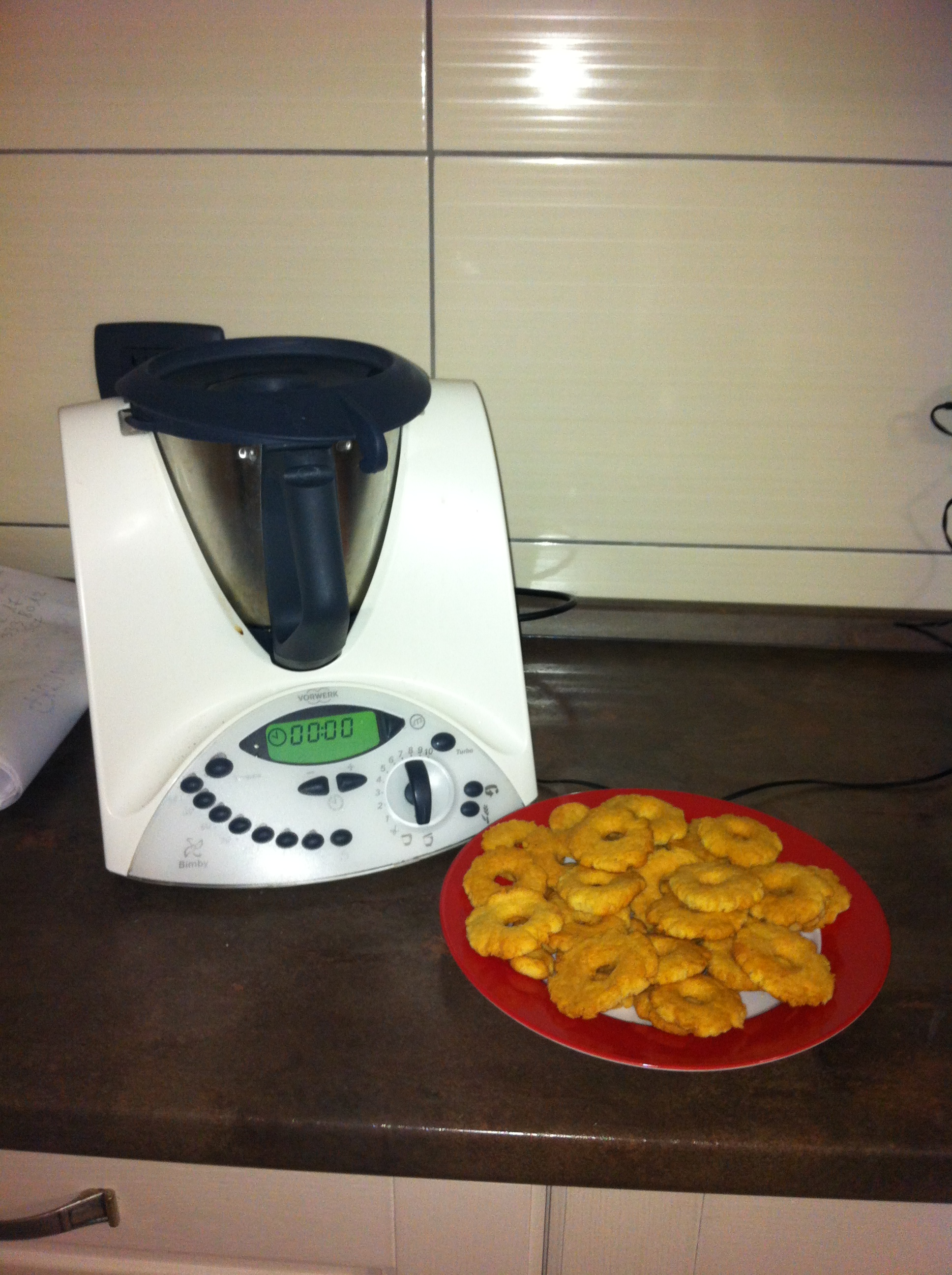 "velocità spiga" 1 minuto ....togliere l'impasto dal boccale formare 35 palline con il misurino schiacciare le palline e fare un foro al centro mettere in una teglia la carta da forno e poggiare i biscotti infornare per circa 1 ora a 160 gradi