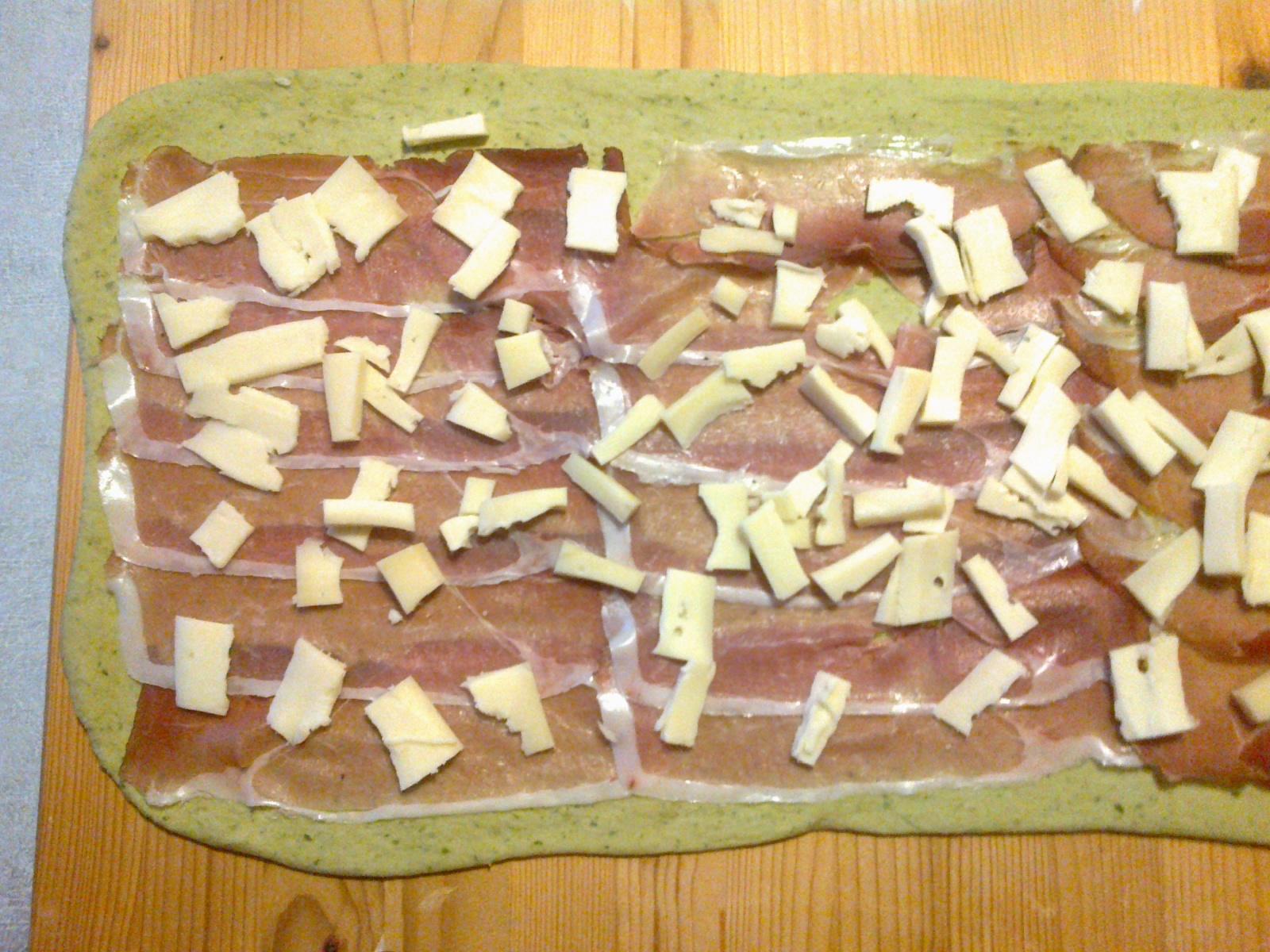 5. Ricoprire il rettangolo d'impasto con le fette di speck e con i pezzetti di fontina.