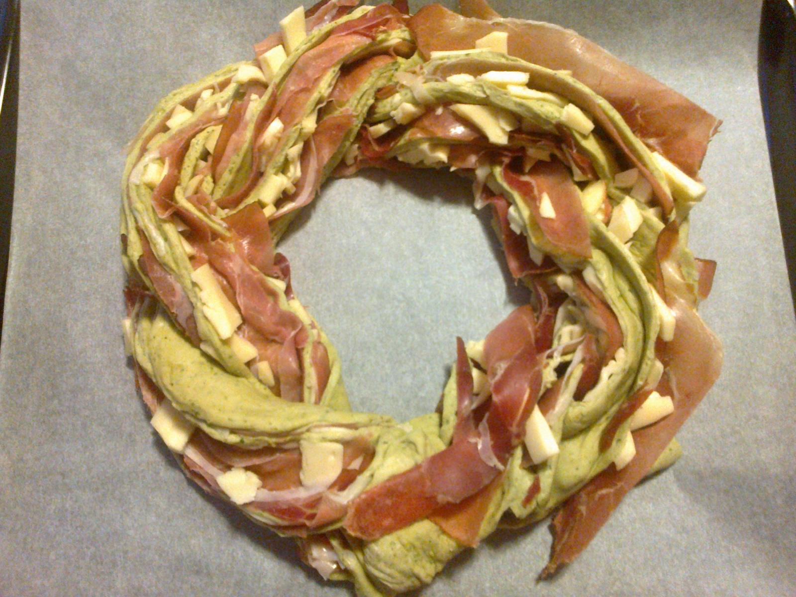 9. Congiungere le estremità dell'intreccio, in modo da ottenere una corona e posizionarla su una teglia rivestita di carta forno.