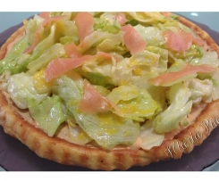 Stendere sulla crostata un leggero strato di salsa cocktail,adagiate l'insalata e decorate con del salmone a striscioline.
