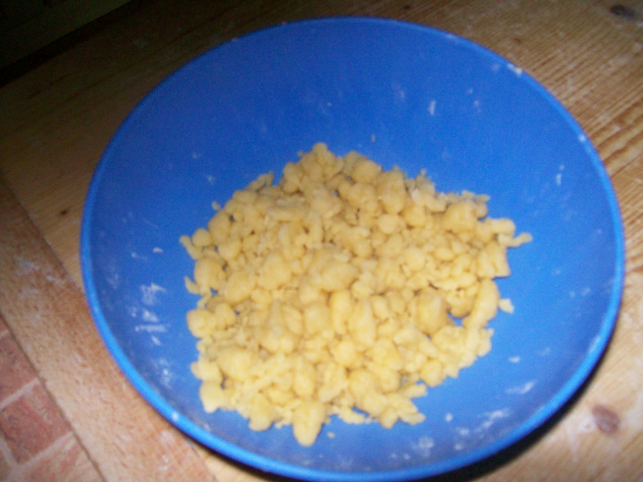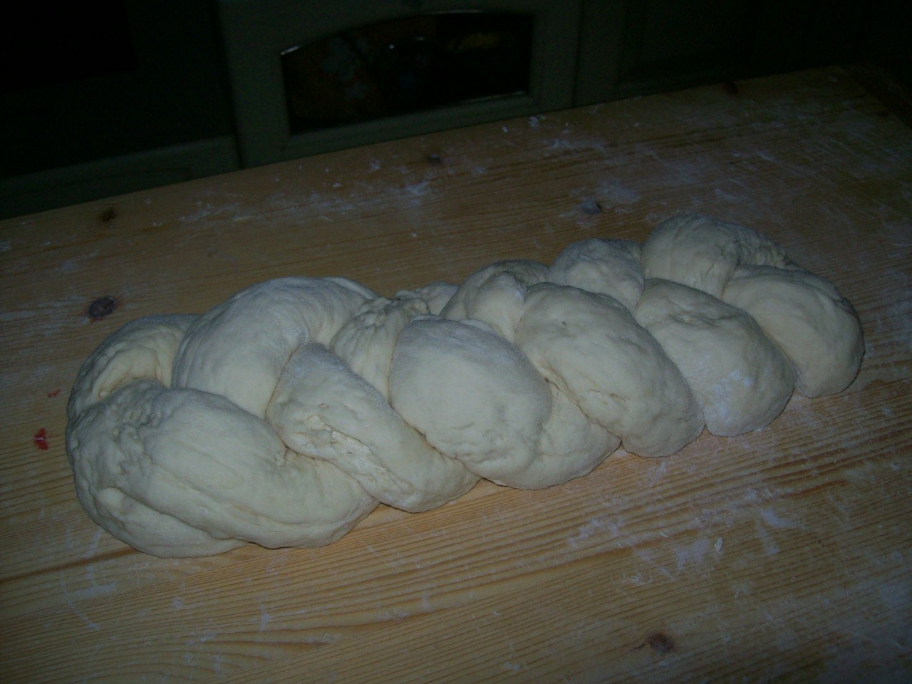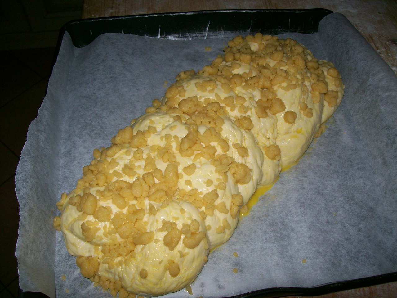 "velocità spiga" . Trasferire l'impasto in una bacinella infarinata, coprirlo, lasciarlo a lievitare fino al raddoppio (1 ora circa). Dividere l'impasto in 2. Poi ogni parte in 3. Lavorarli sulla spianatoia infarinata, formando ben 6 rotoli lunghi ( 3+3). Preparare 2 trecce.Rivestire una grande teglia con la carta da forno, sistemarvi le trecce; lasciarle a lievitare per 30min, circa. Nel frattempo, accendere il forno: 180° e praparare la "sbriciolata". In una ciotola mettere la farina e lo zucchero a velo, mischiarli bene. Sciogliere il burro in un pentolino, aggiungerlo alla farina. "Impastare" gli ingredienti fino ad ottenere delle bricciole. Sbattere l'uovo. Le trecce pronte, spennellare con l'uovo, decorare con le bricciole, infornare per 25-30 min circa.