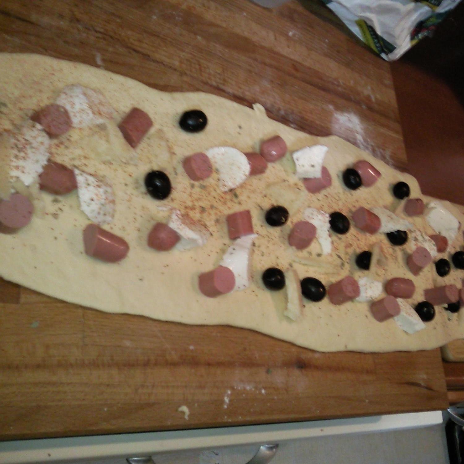 Una volta lievitato, stendere l'impasto in lungo come in foto, distribuire gli ingredienti del ripieno e richiudere arrotolando.
