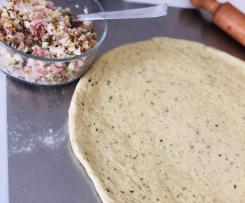 altezza. Dividere questo cerchio in 12 parti e iniziando dalla parte più larga, farcire con composto di mortadella pistacchi e scamorza avendo cura di sigillare bene i margini e tirando la punta più stretta, avvolgere formando