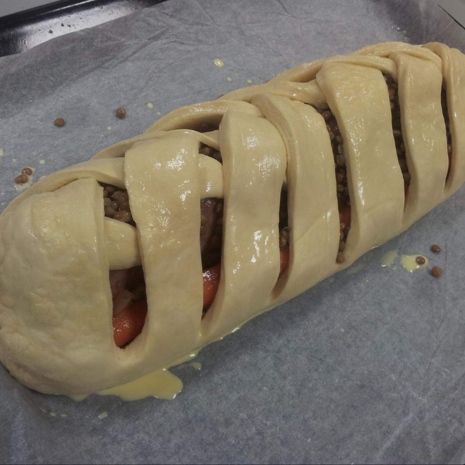 "coperchio chiuso" 1 litro d'acqua posizionare nel recipiente del Varoma i due cotechini (ancora nella confezione di alluminio) precotti e le 4 carote e cuocere per 20 min temp varoma vel 1. Togliere i cotechini dall'involucro di alluminio e eliminare la pelle (o budello).3. Stendere l'impasto formando un rettangolo. Posizionare le 4 carote (in fila per due) e i cotechini nel mezzo. Coprire con le lenticchie. Comporre la treccia. Spennellare la superficie con un'emulsione di tuorlo e latte. Posizionare la treccia sulla leccarda
