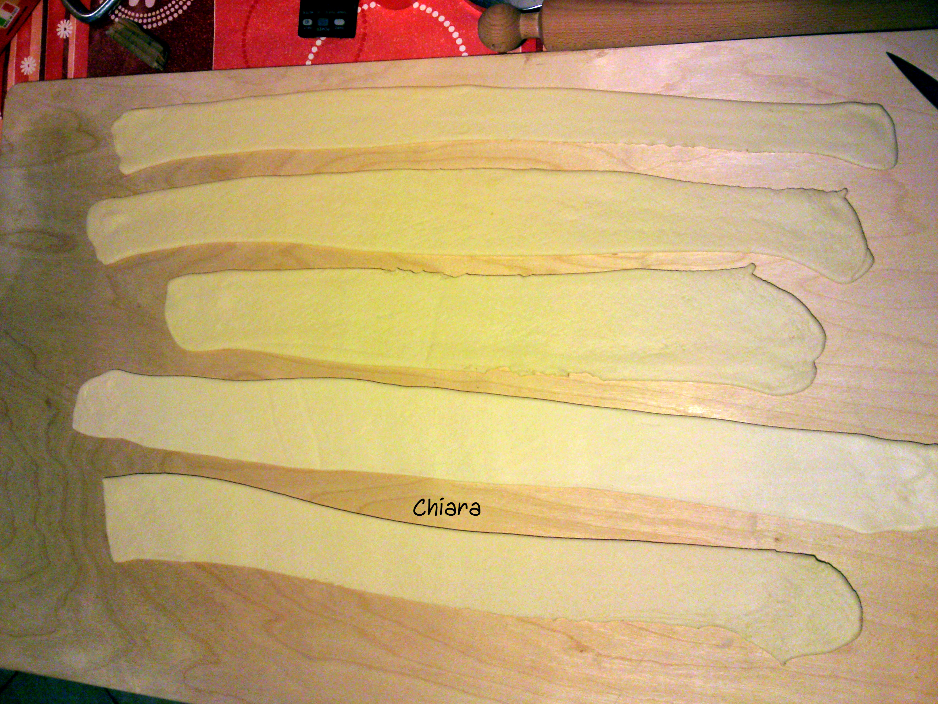 Usando la macchinetta tira pasta (nonna papera), nel primo spessore (il più largo), fare delle striscie strette e lunghe 50/60 cm.