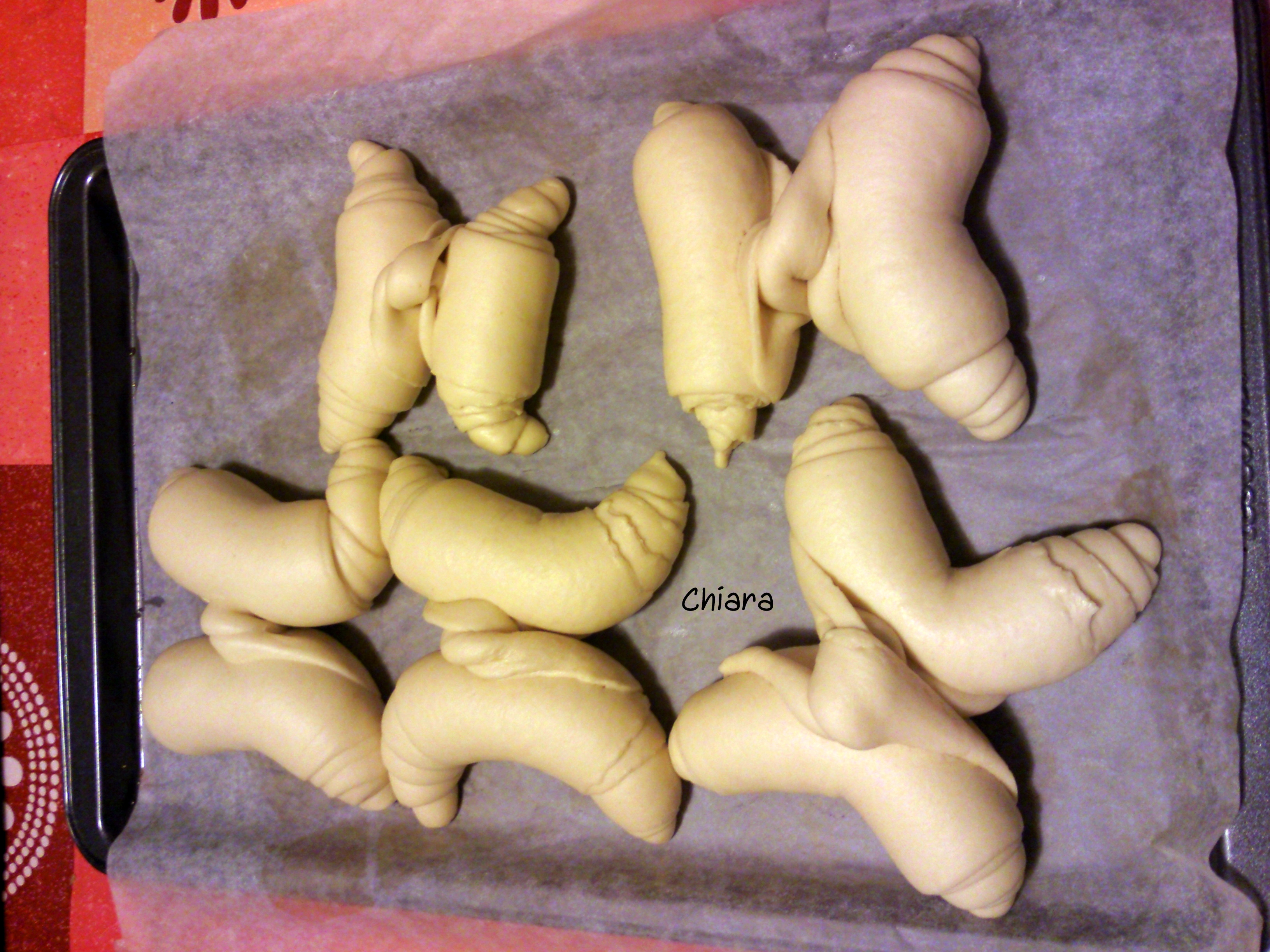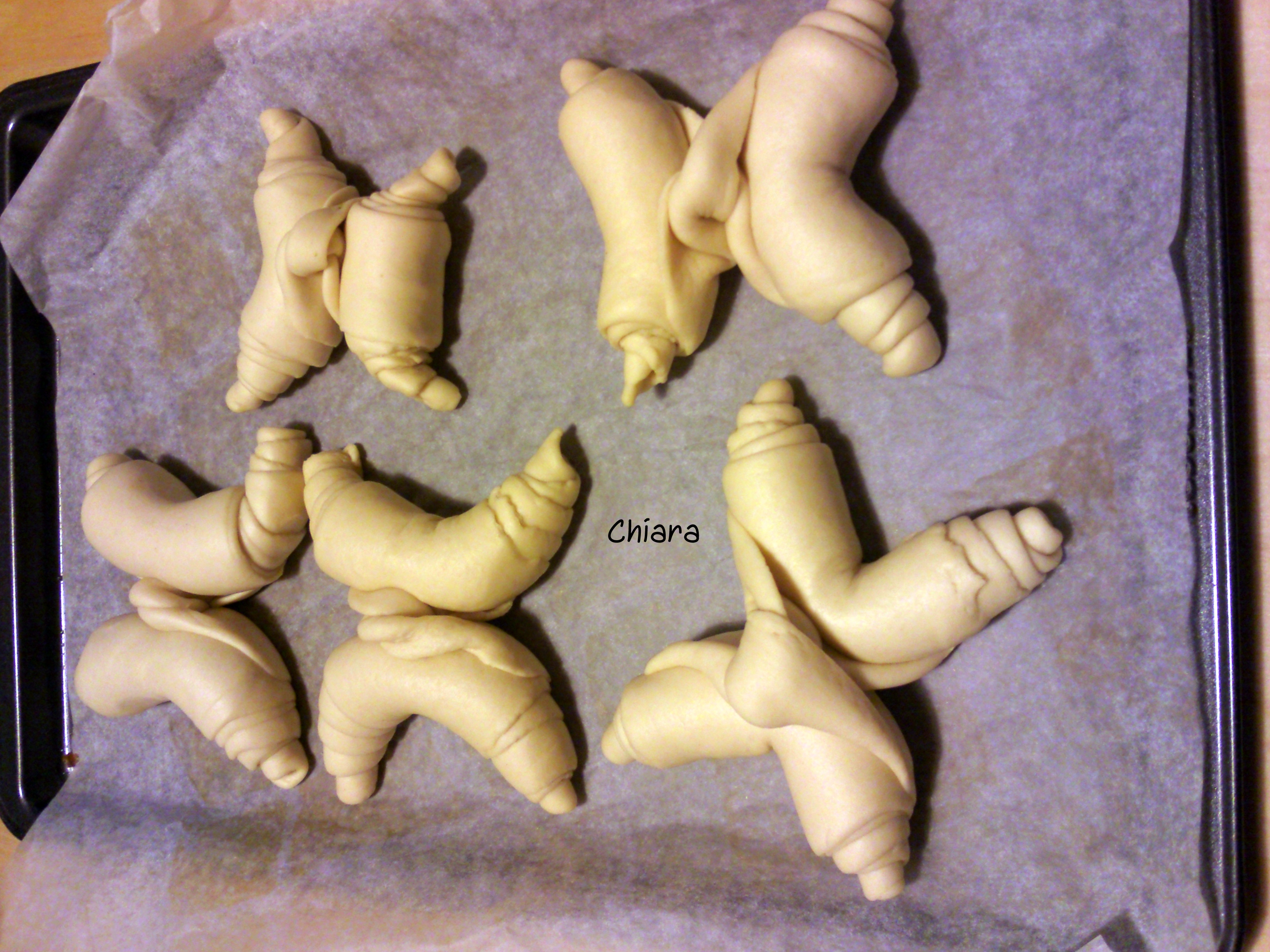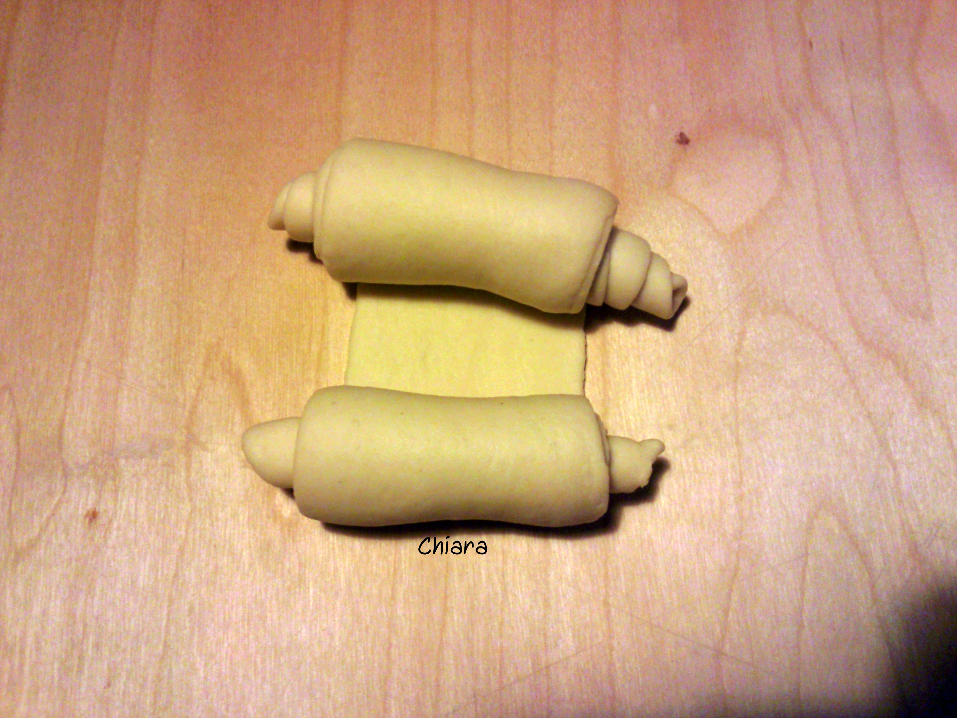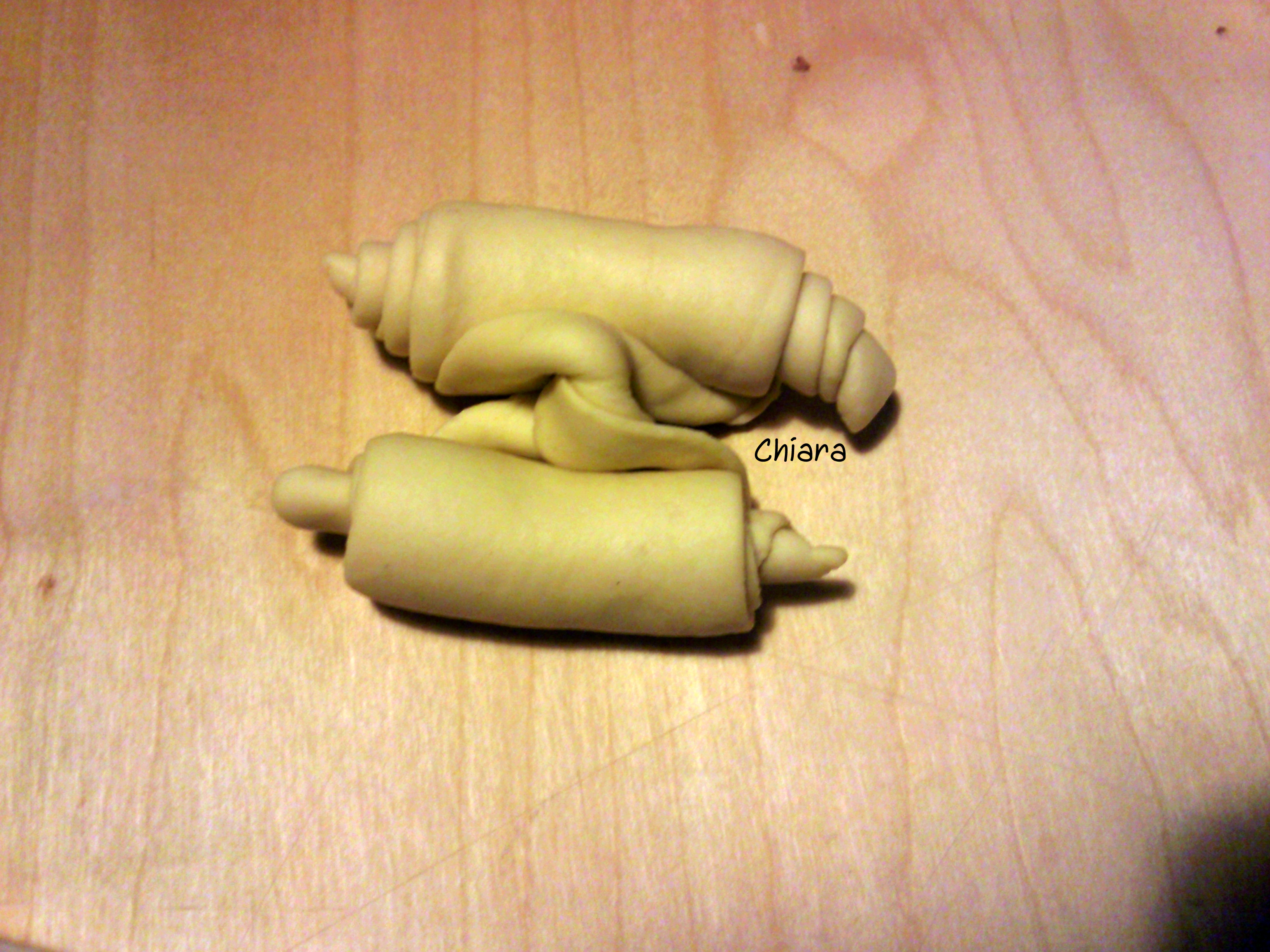 Fare ruotare 2 volte su sè stesso un rotolino, unirlo all'altro e incurvarli entrambi x ottenere la classica forma delle crocette.