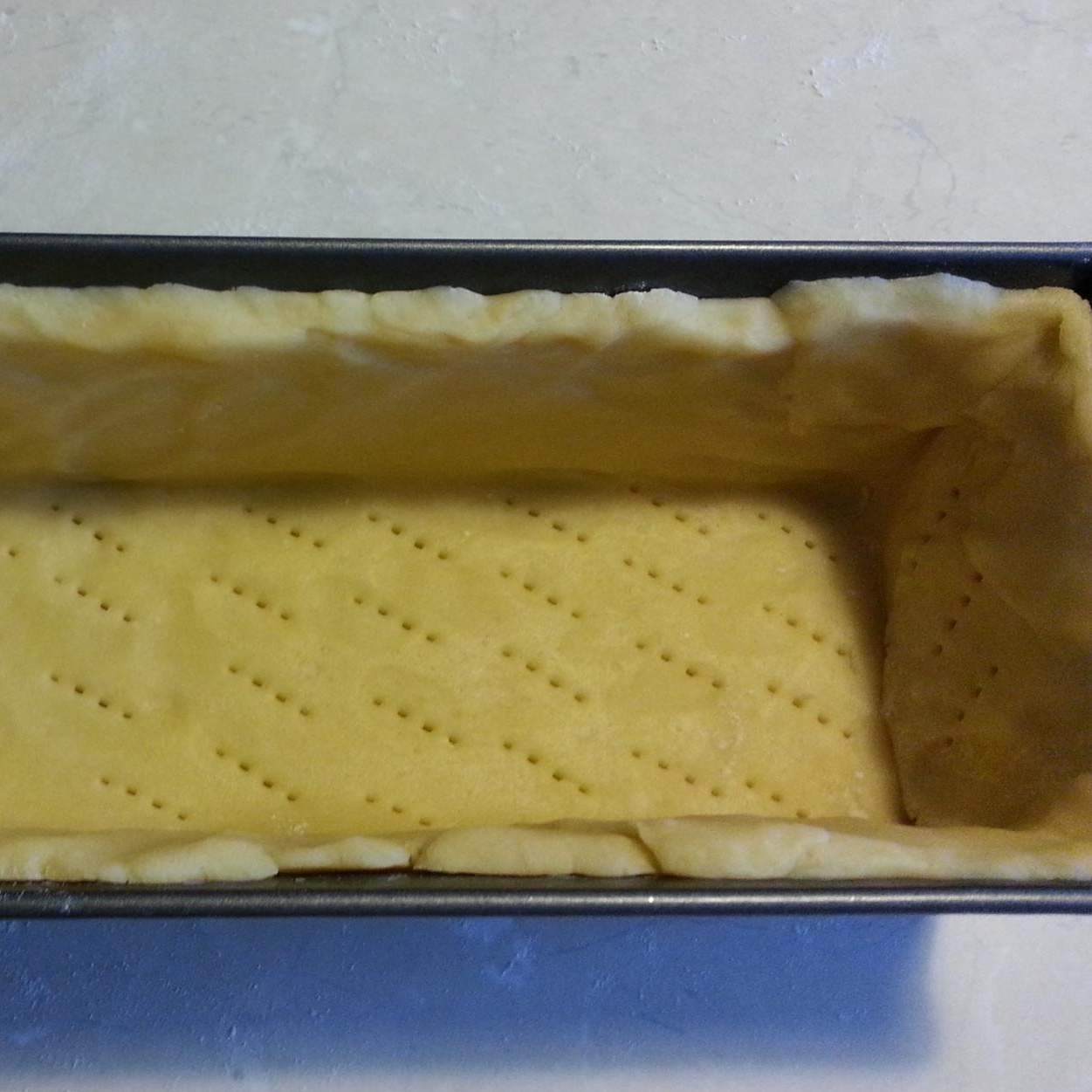 Dopo il riposo riprendere l'impasto e stenderlo ad uno spessore di circa 5mm e foderare uno stampo da plumcake imburrato e infarinato, tagliare la parte in eccesso dai bordi e bucherellare con la forchetta il fondo, poi cuocere in forno caldo a 180° per circa 25 minuti.