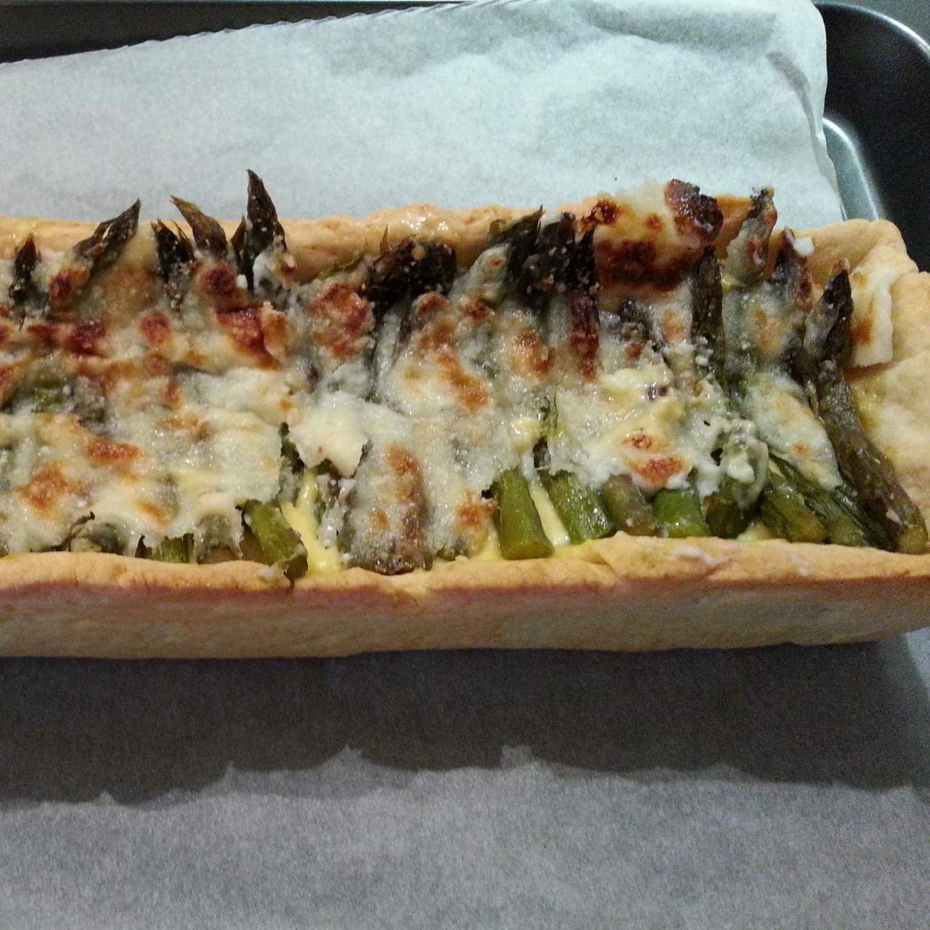Una volta cotta la crostata, distribuirvi dentro le uova cremose e appoggiarvi sopra gli asparagi gratinati.