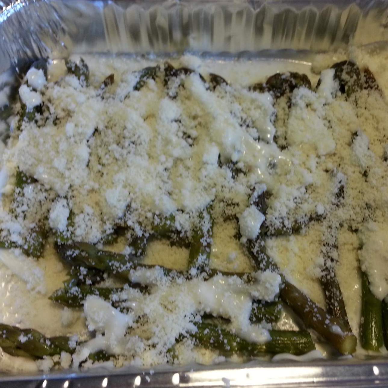 Siccome mi era avanzata una piccola quantità di besciamella, io ho unto la vaschetta con la besciamella, che ho poi distribuito un po' anche sugli asparagi, per poi gratinarli e anche con la besciamella vengono bene e saporiti.