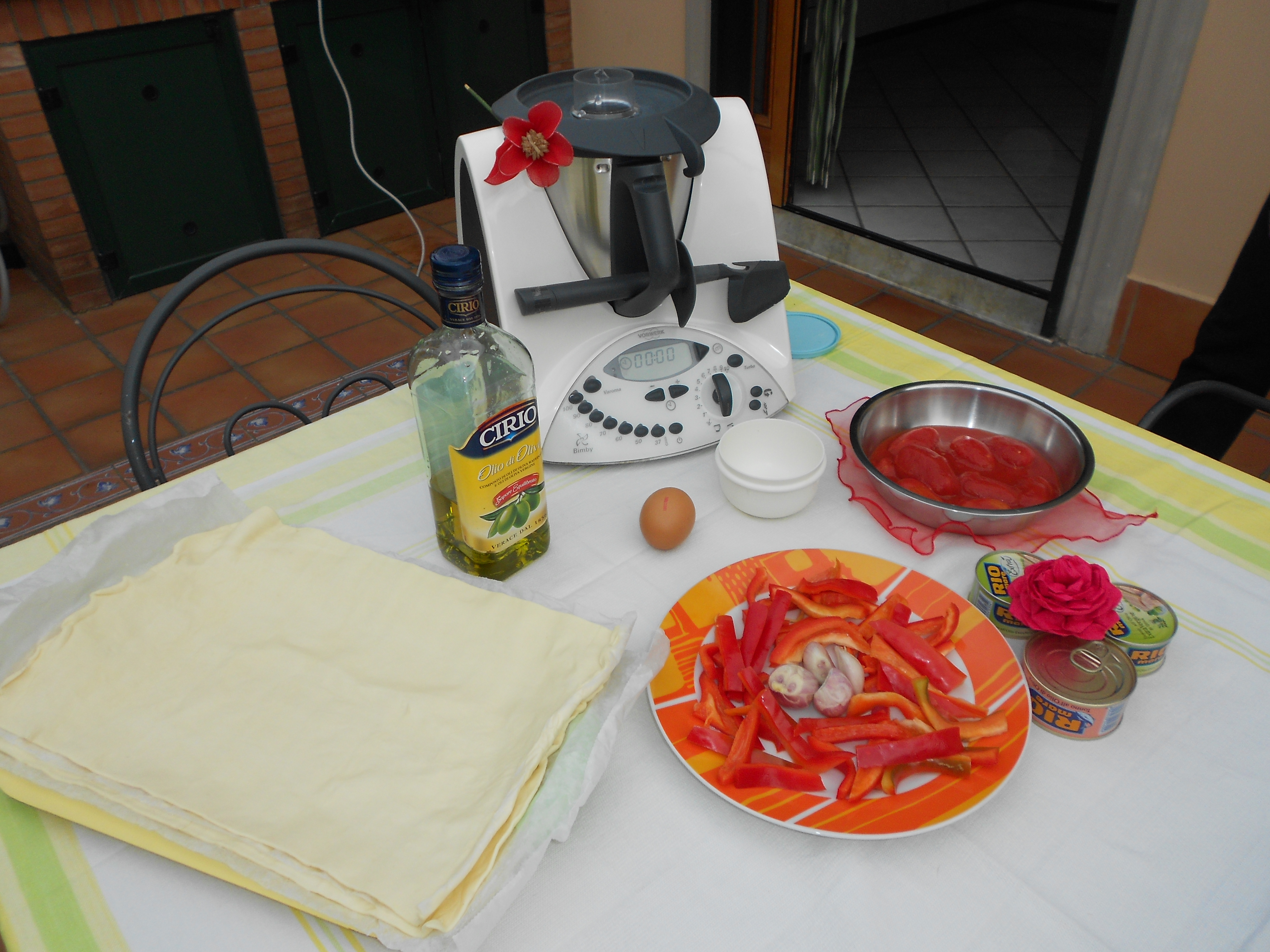 "coperchio chiuso" il tonno , con il pomodoro cotto e i peperoni . Amalgamare 5 sec vel 3. Foderare lo stampo rettangolare con metà dose di pasta sfoglia . Aggiungere il ripieno e coprire con la restante metà .Spennellare col tuorlo d'uovo . Cuocere in forno 25 min 200° .