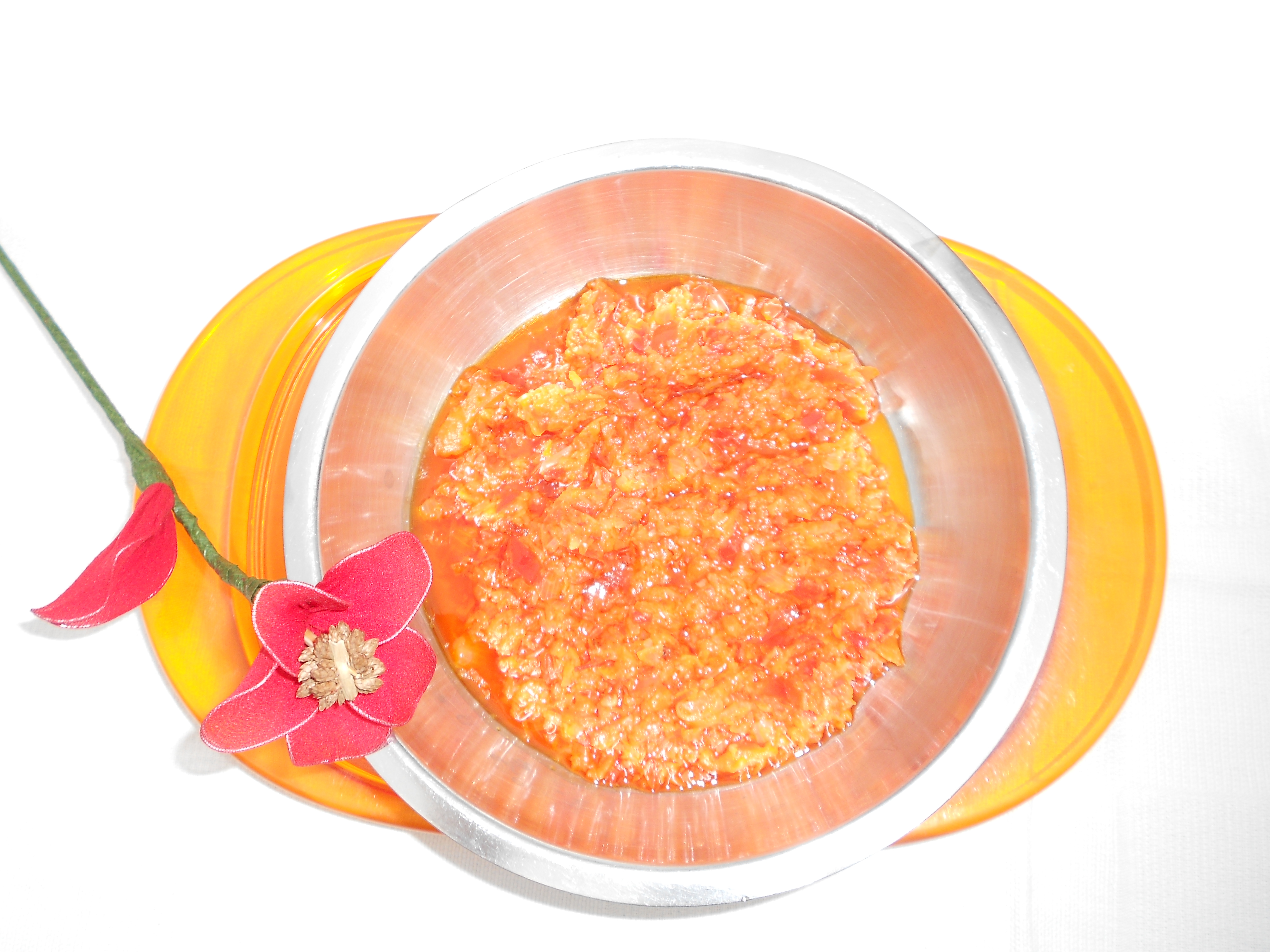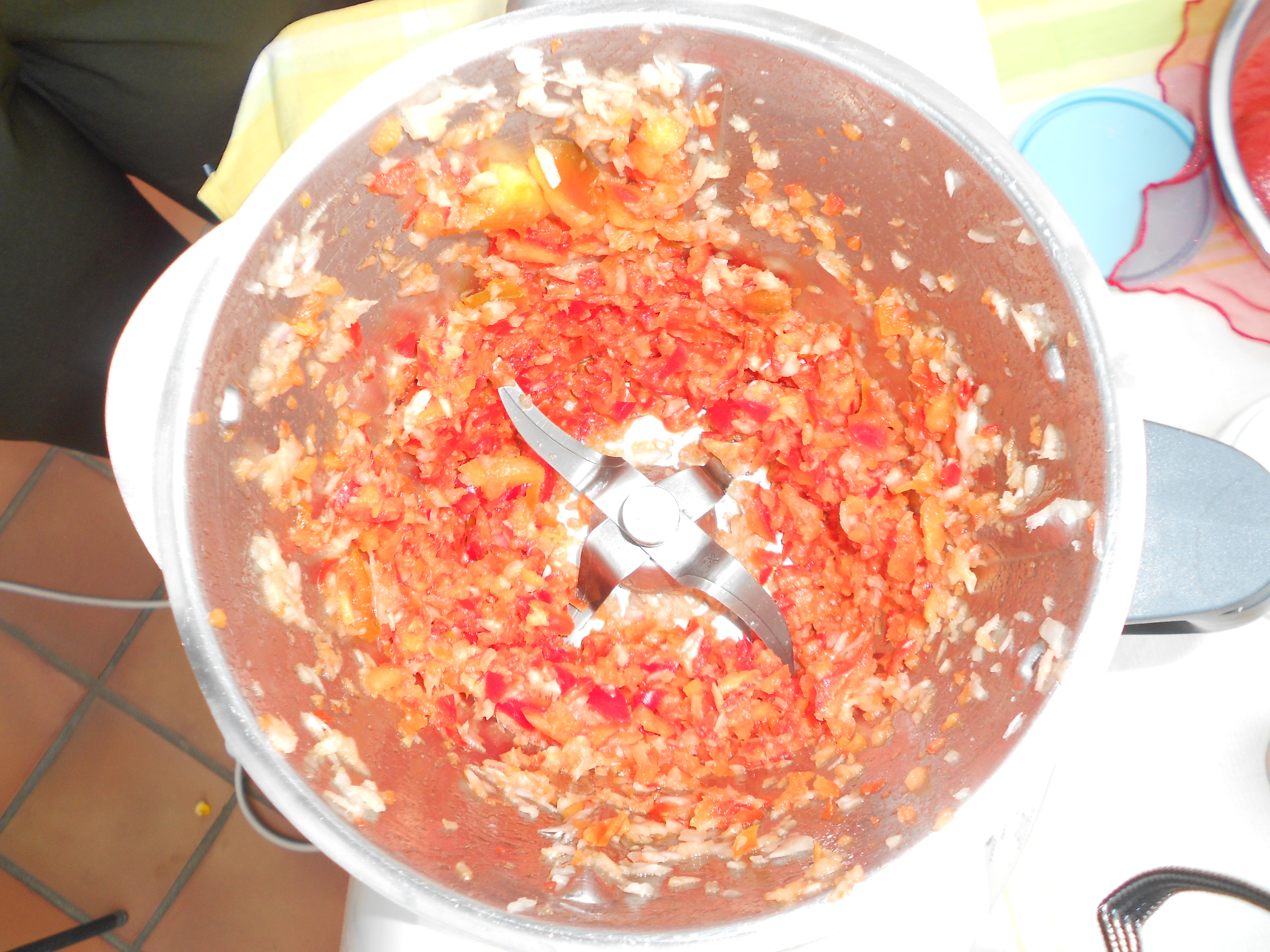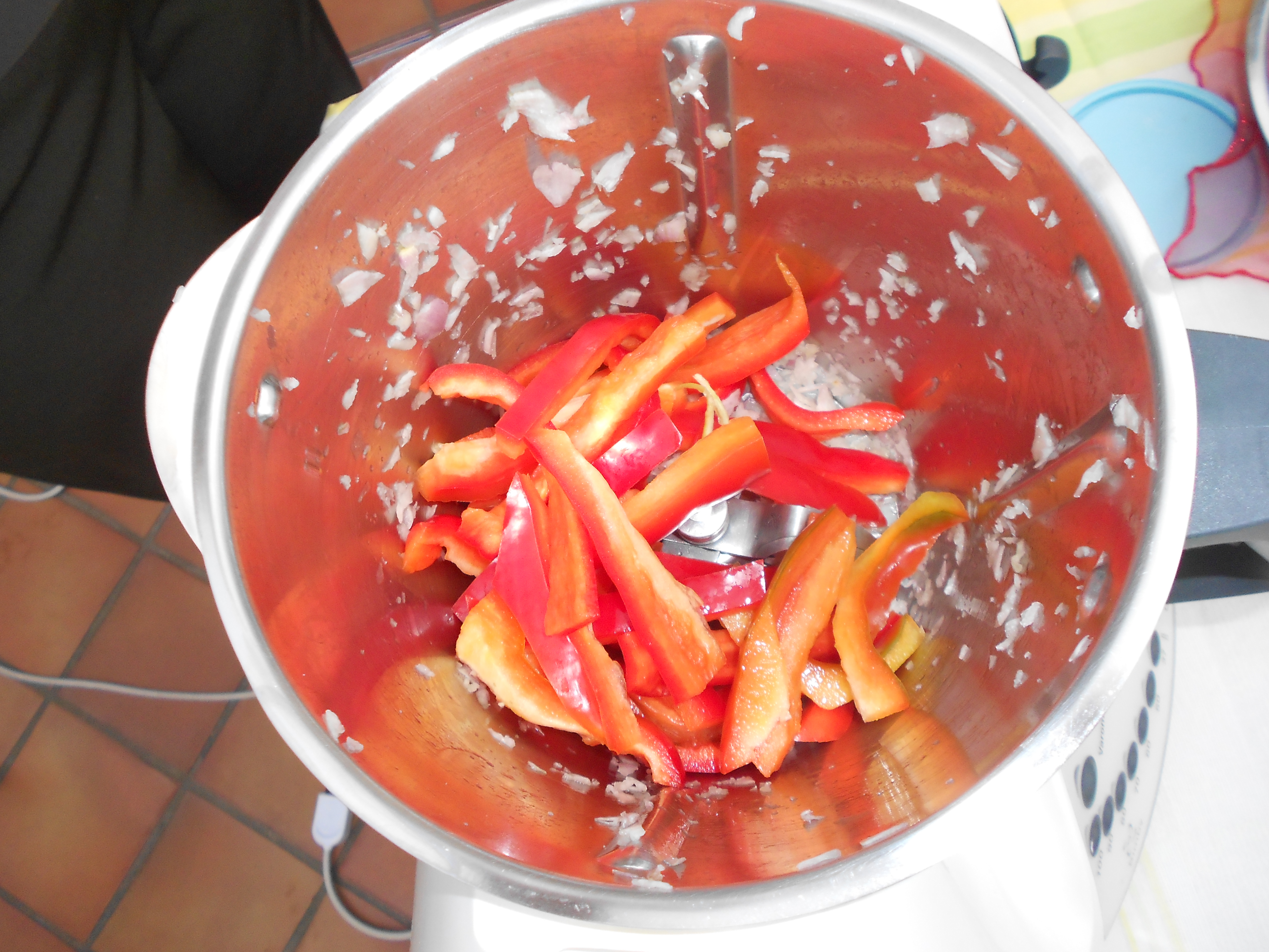 Tritare la cipolla 3 sec vel. 7 .Aggiungere il peperone e tritare 4 sec vel .5 . Unire olio ( 30 g ) e sale . cuocere 15 min 100°