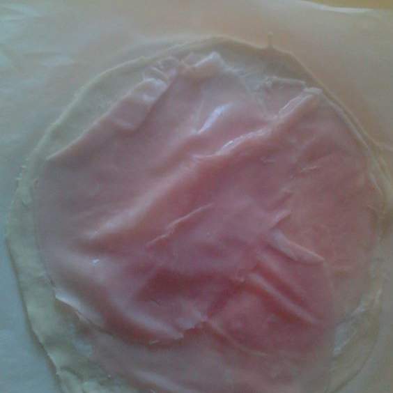 Mettere della carta da forno sotto il primo disco e farcirlo con il formaggio senza arrivare ai bordi, aggiungere il prosciutto cotto