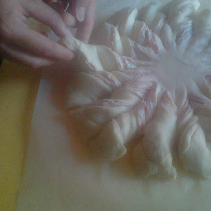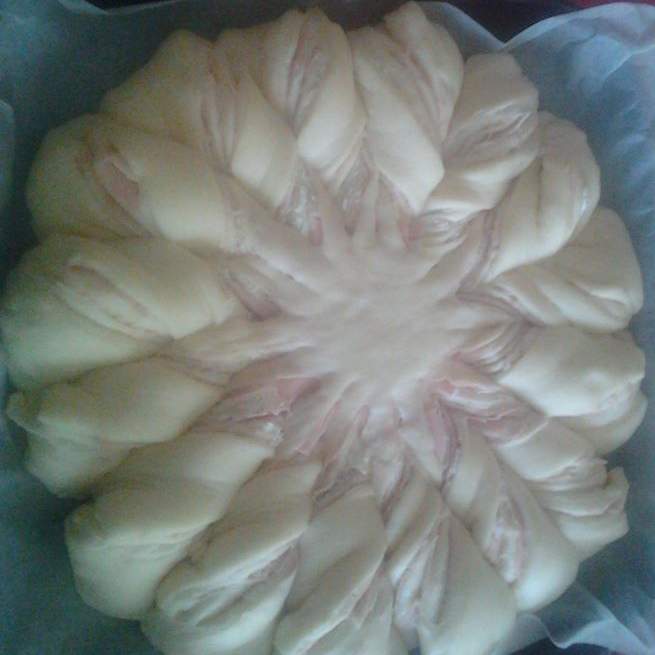 Aiutandovi con la carta forno spostate il fiore in un tegame e lasciate lievitare per almeno 2 ore