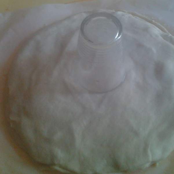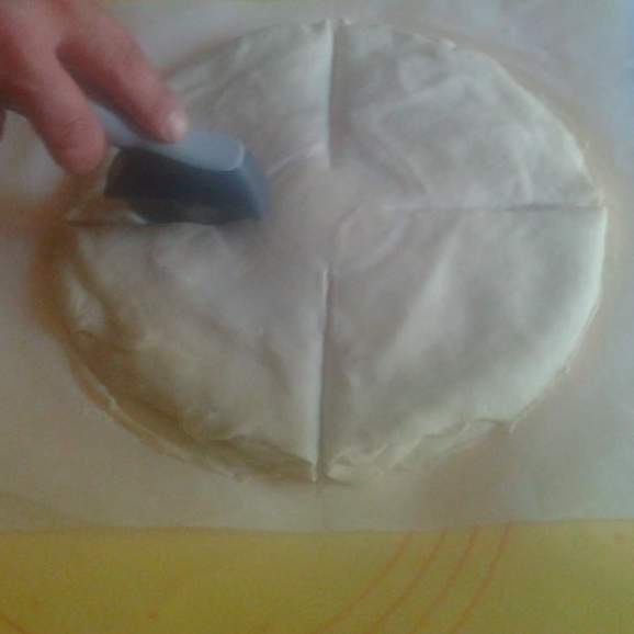 Posizinare al centro dei dischi un bicchiere e con l'aiuto di un taglia pizza dividere l'impasto in 4 spicchi senza tagliare la parte centrale quella segnata dal bicchiere