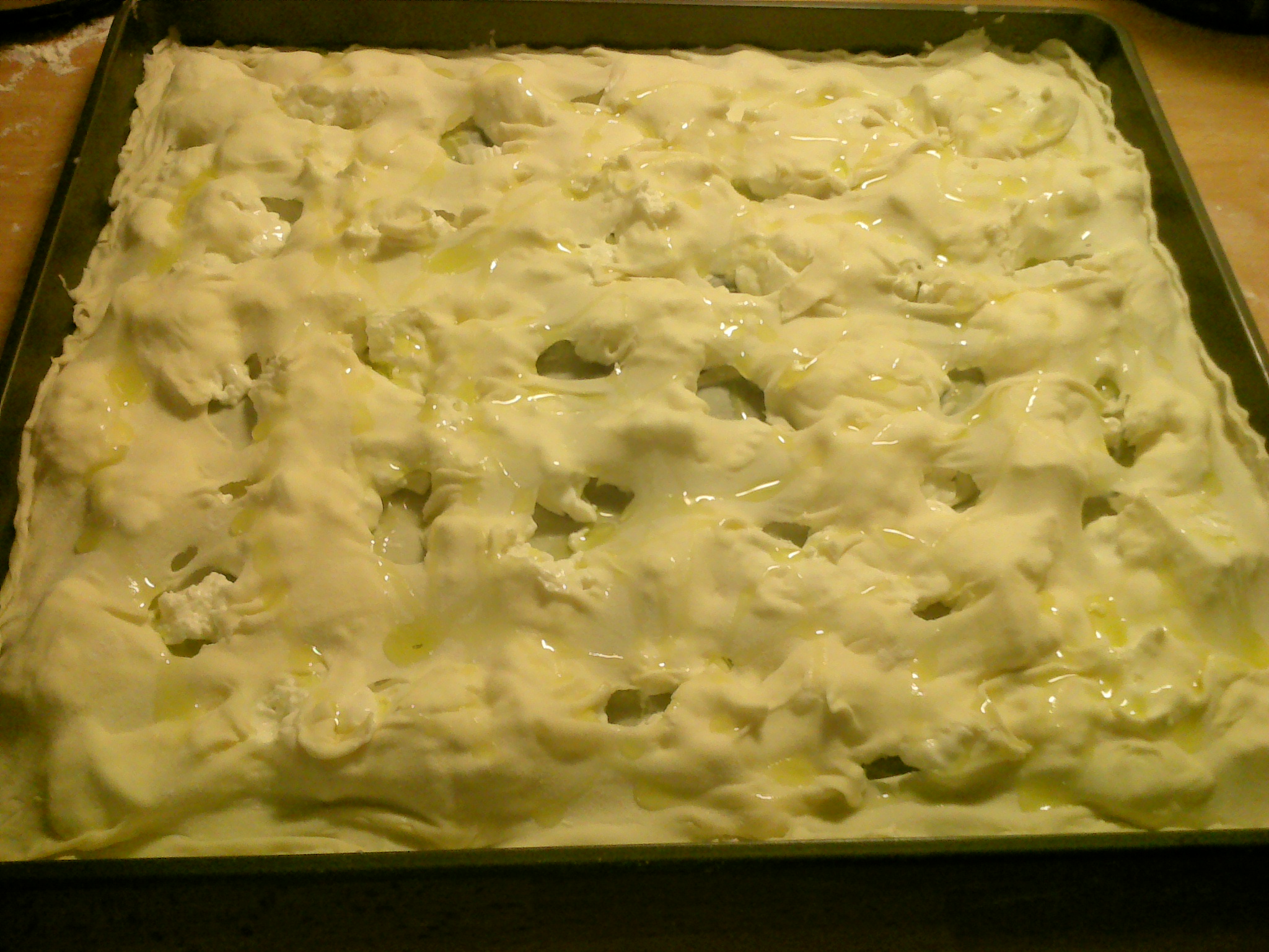- Trasferire in una teglia unta con olio (teglia la mia 50x40) e farcre con tutto lo stracchino rompendolo a pezzi con le mani;