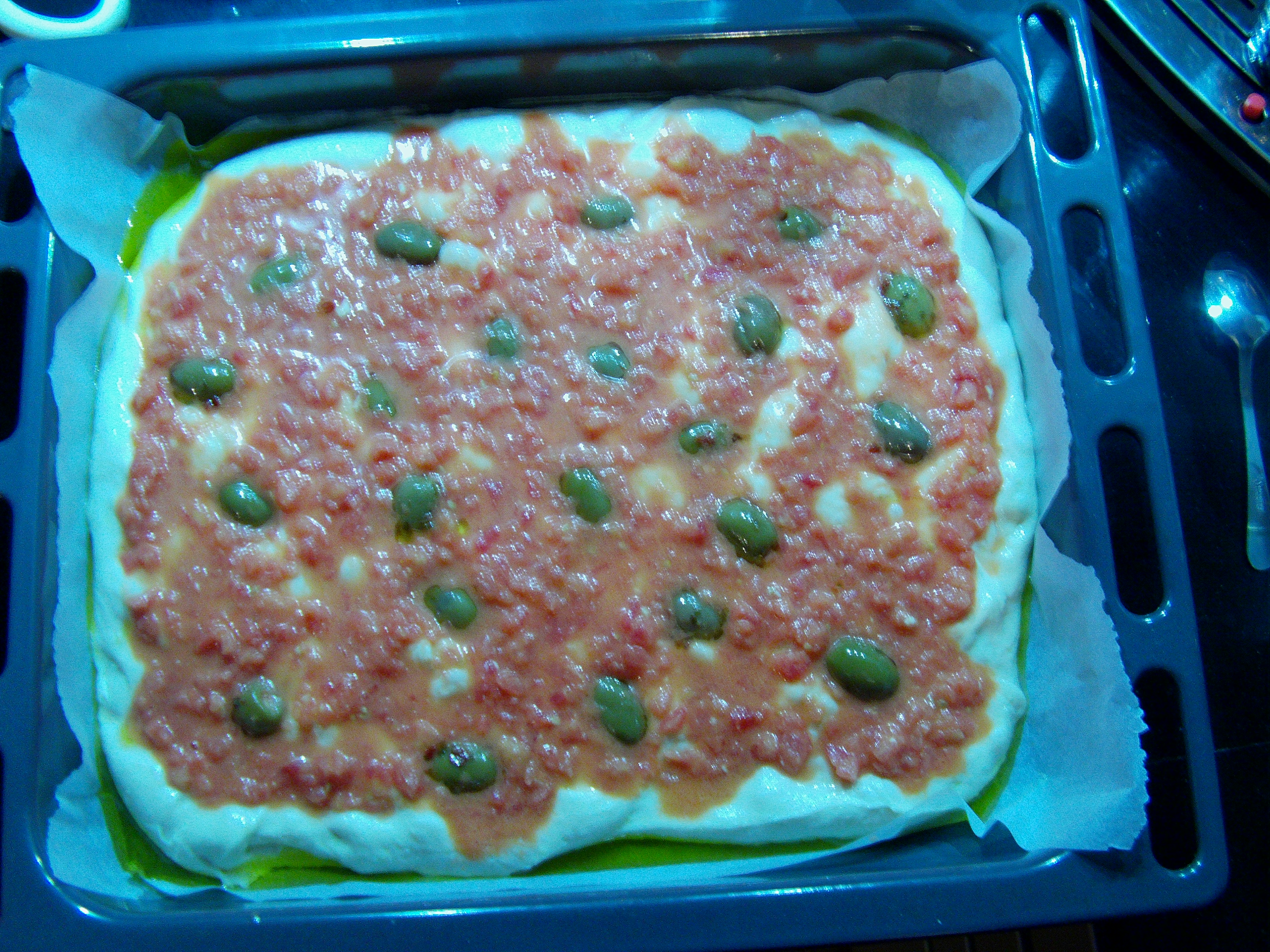 - Coprire la superficie dell'impasto con la farcia, quindi aggiungere le olive, inserendole con le dita all'interno dell'impasto e lasciare lievitare per circa 20 min;